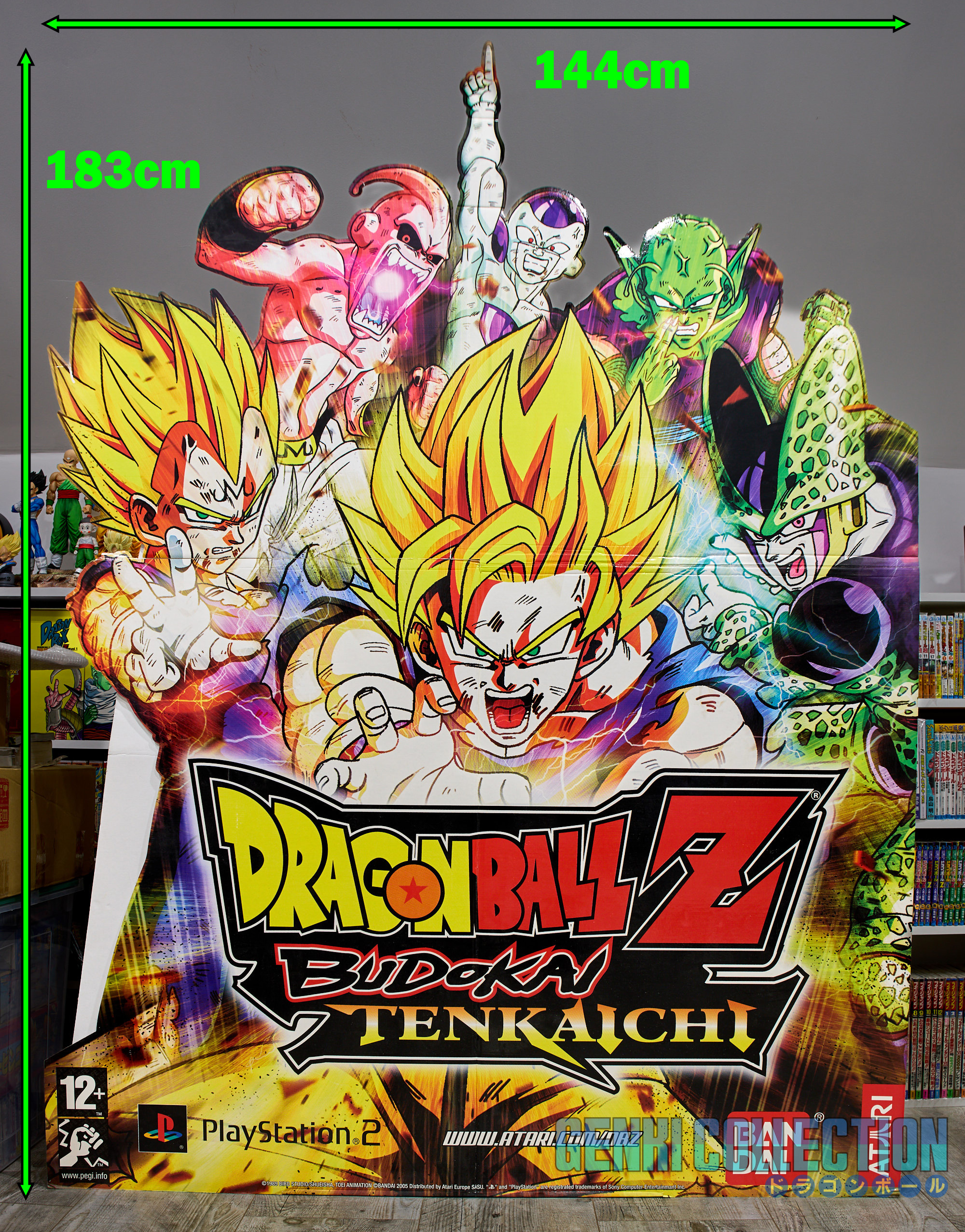 Standing géant 183cmx144cm DRAGON BALL Z BUDOKAI TENKAICHIStanding promotionnel de très grande taille (183cm de hauteur par 144cm de largeur) réalisé pour la promotion du jeu DRAGON BALL Z BUDOKAI TENKAICHI. Globalement en très bon état, à noter surtout un petit pli au niveau du bras de Freeza.