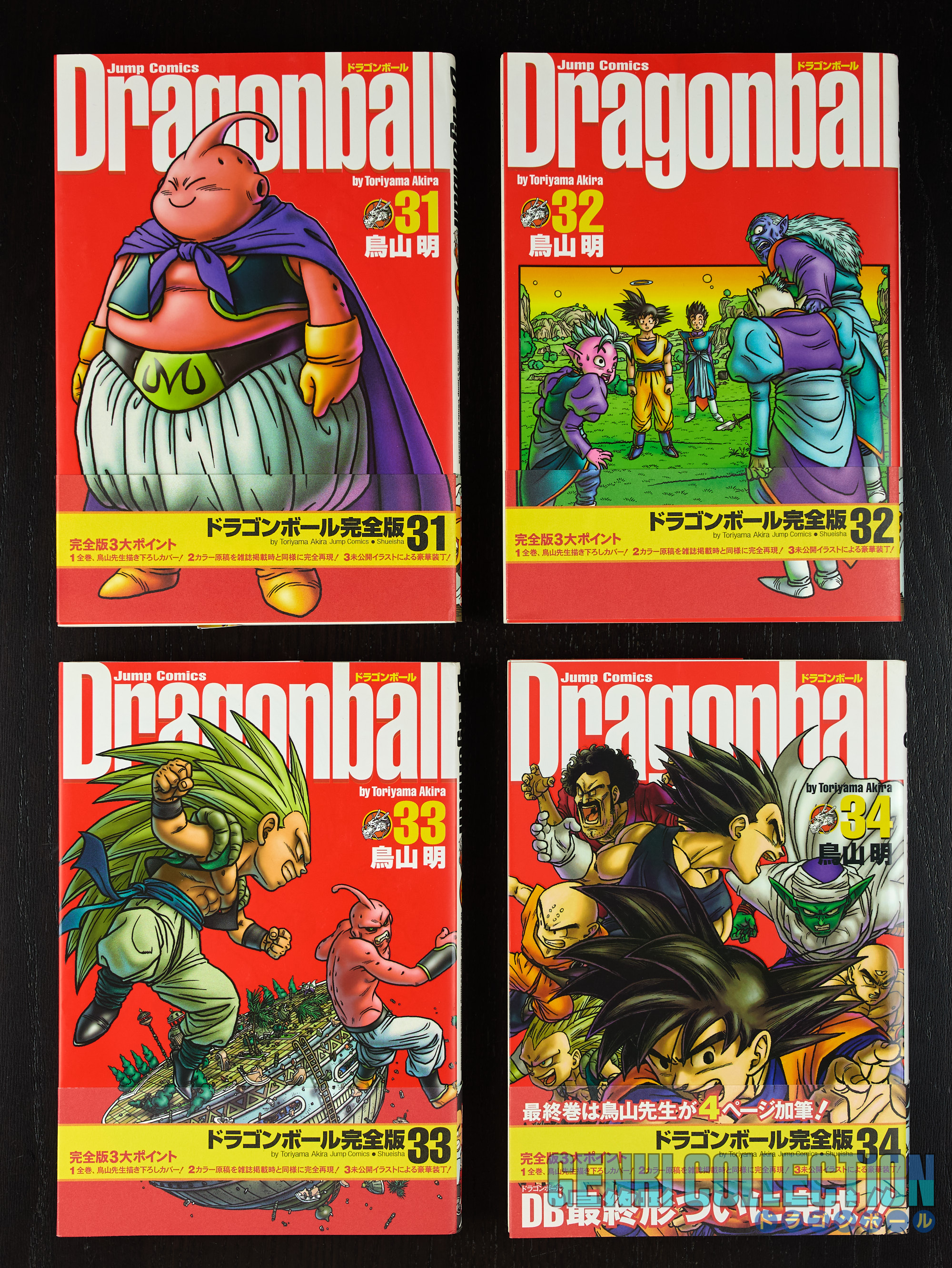 Intrégrale des 34 tomes japonais DRAGON BALL édition KANZENBAN (ou PERFECT EDITION) en très bon état, 31 tomes sont en PREMIÈRE ÉDITION, seuls les tomes 1, 2 et 14 sont en deuxième édition, tous les tomes possèdent leur OBI. À noter également que tous les tomes possèdent leurs flyers poblicitaires, excepté le tome 34 et les tomes seconde édition 1, 2 et 14. S'ajoute à cela le tome NEKO MAJIN édition KANZENBAN avec son OBI + le tome de Jako, également en édition KANZENBAN avec son coffret collector incluant un porte-clé, une carte postale et un sticker et enfin le tome de SAND LAND en édition KANZENBAN, scellé sous blister. Une édition grande améliorée par rapport à l'édition originale, avec un plus grand format et une meilleur définition des planches afin de mieux les apprécier, les pages originales d'Akira Toriyama colorisées ou en quadrichromie sont présentes. Une magnifique édition !