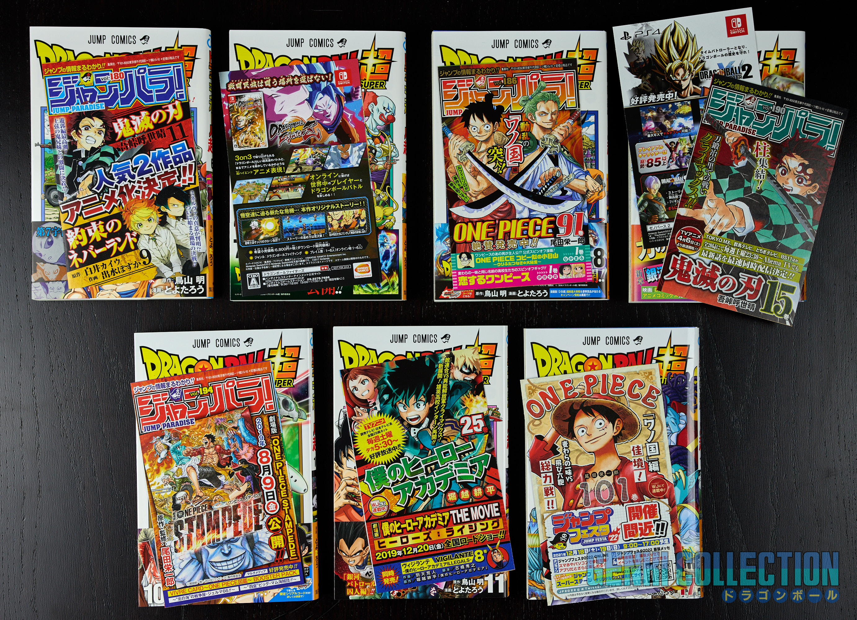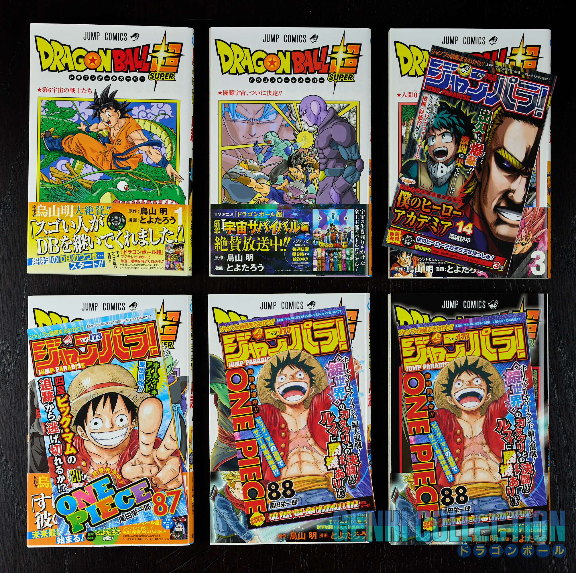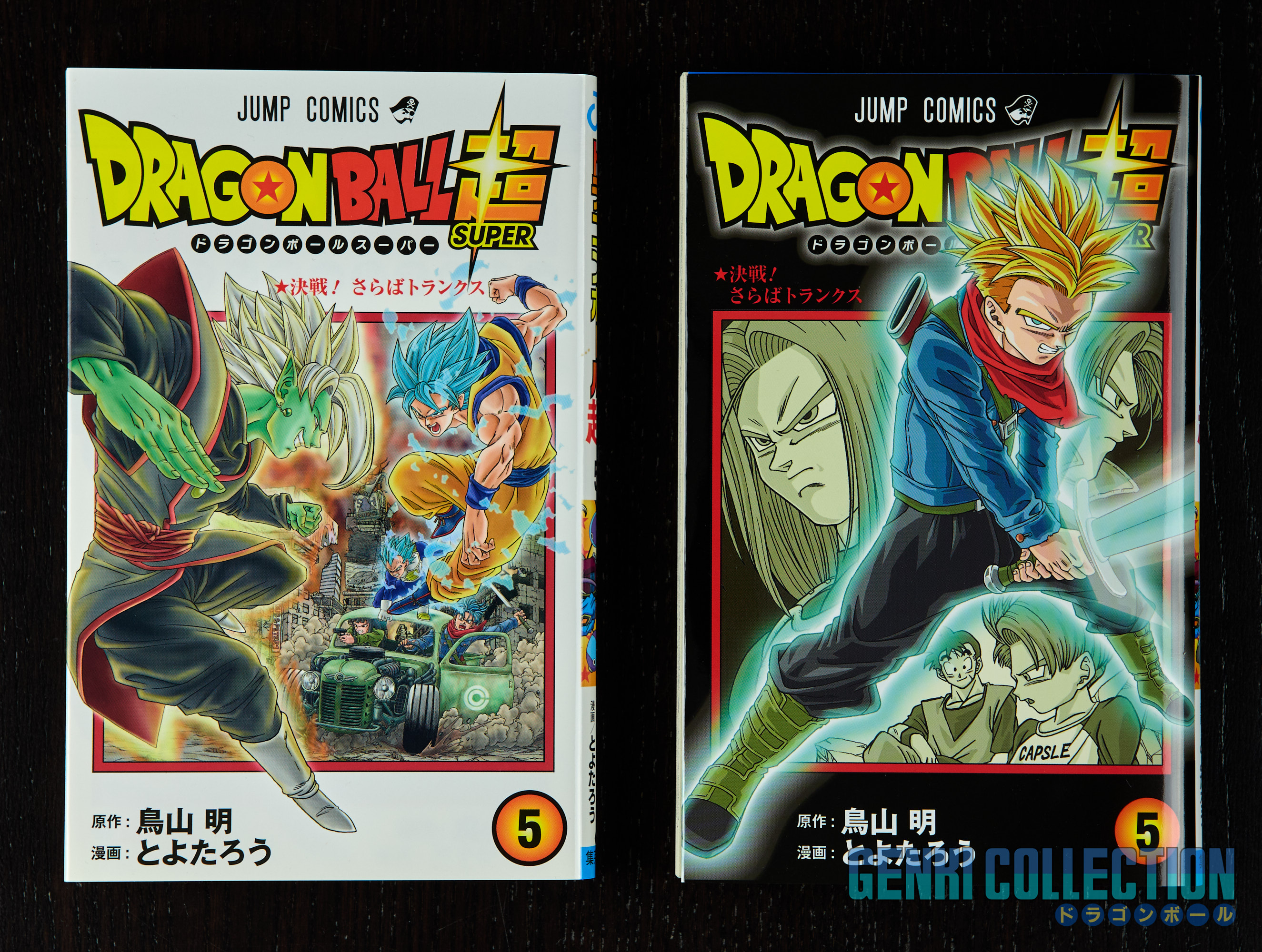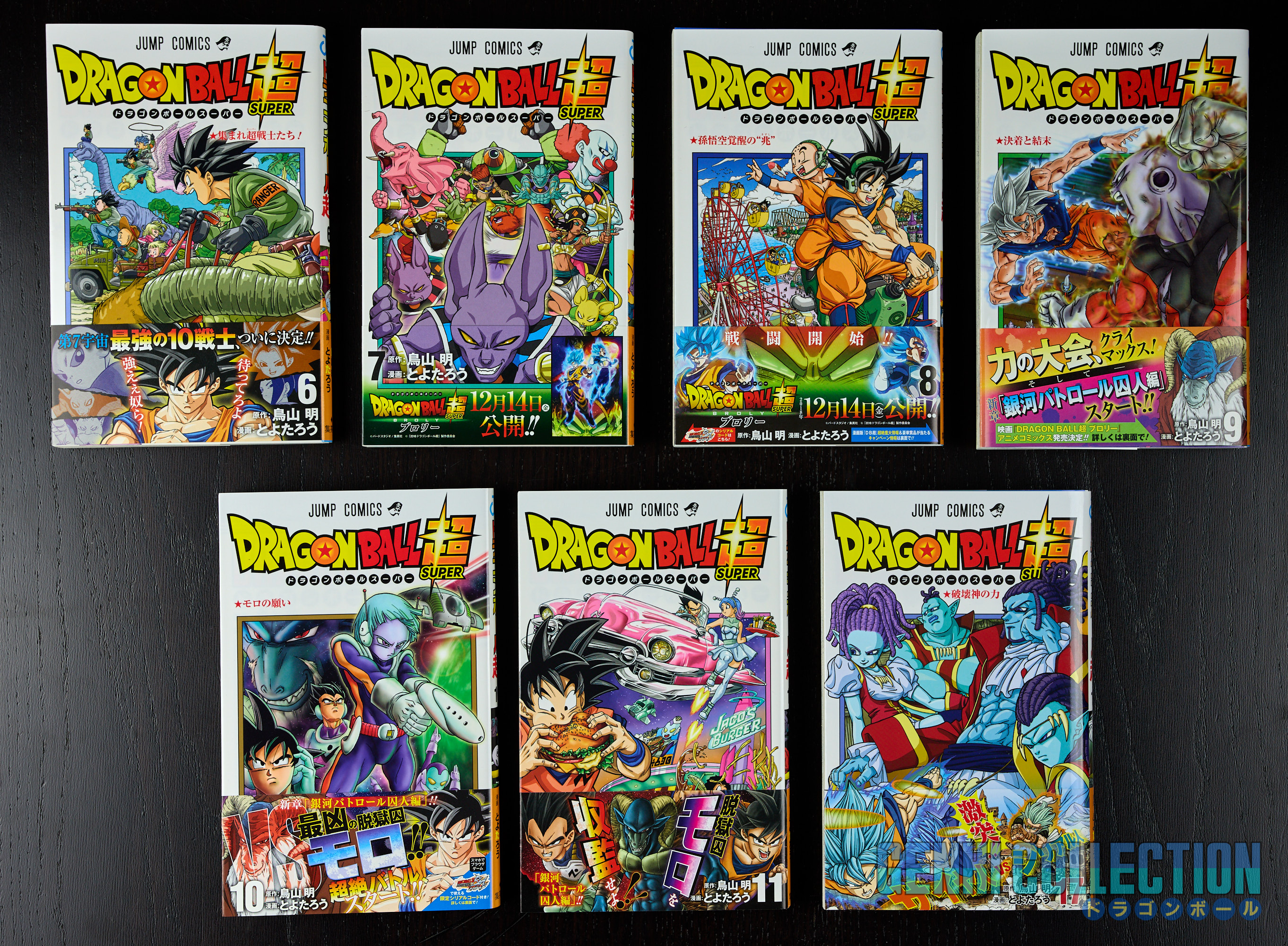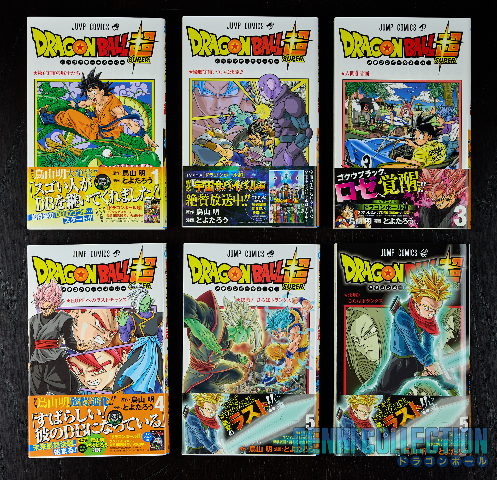 Lot de tomes japonais DRAGON BALL SUPER 1 à 11 + 17 avec vol 5 en double couverture limitée.Lot de tomes japonais DRAGON BALL SUPER 1 à 11 + 17, tous avec OBI. Le volume 5 est en double, un avec la couverture standard, le second avec une couverture noire en édition limitée reprenant le futur de Trunks. Les tomes 3 à 11 + 17 sont des premières éditions avec flyer publicitaires. Tomes en excellent état.