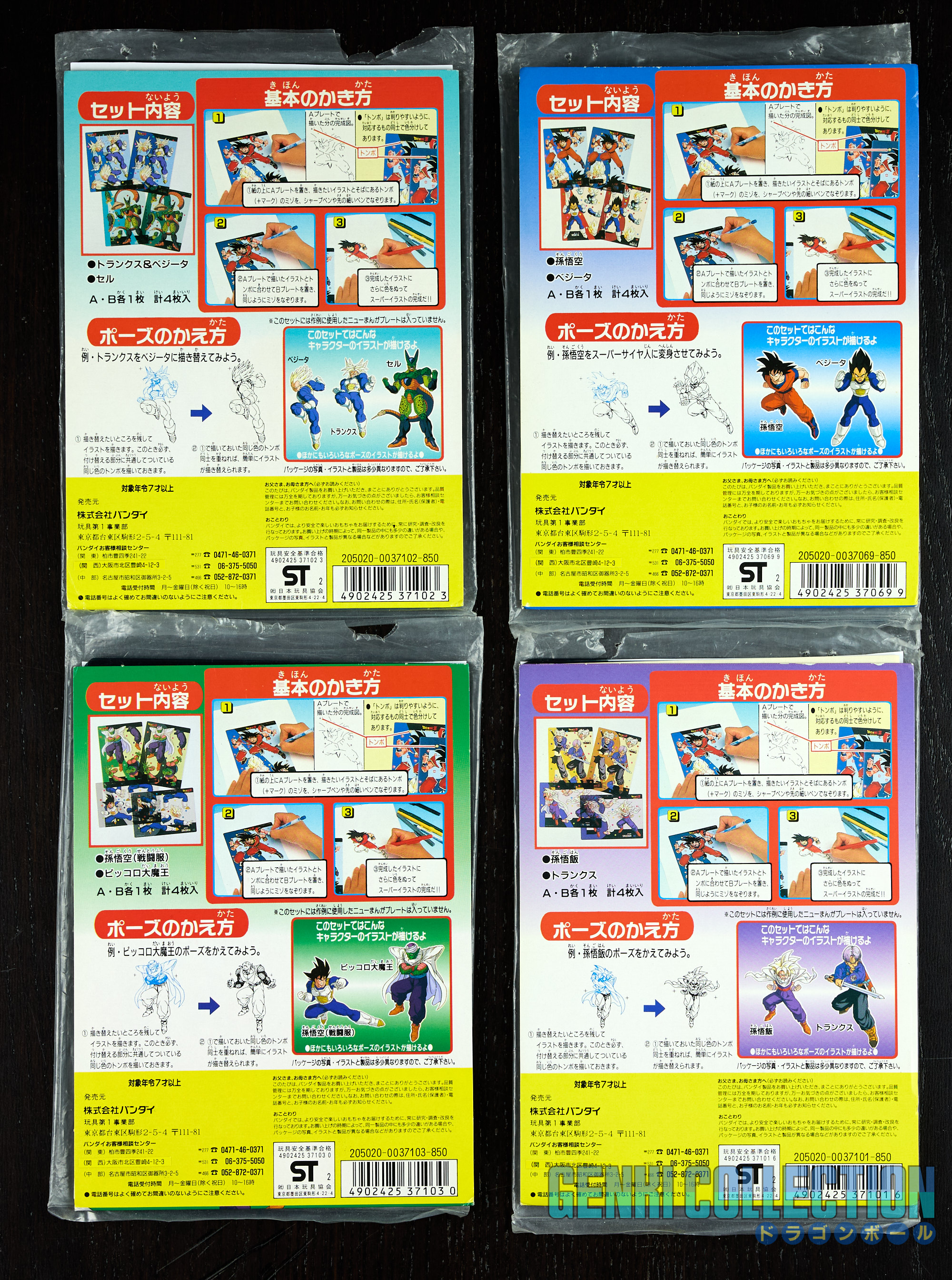 Lots de 4 sets DRAGON BALL Z MANGA PLATE contenant chacun 2 sets de 2 planche en plastique permettant de dessiner les personnages de DBZ selon divers positions. Articles originaux et rares de 1992.
