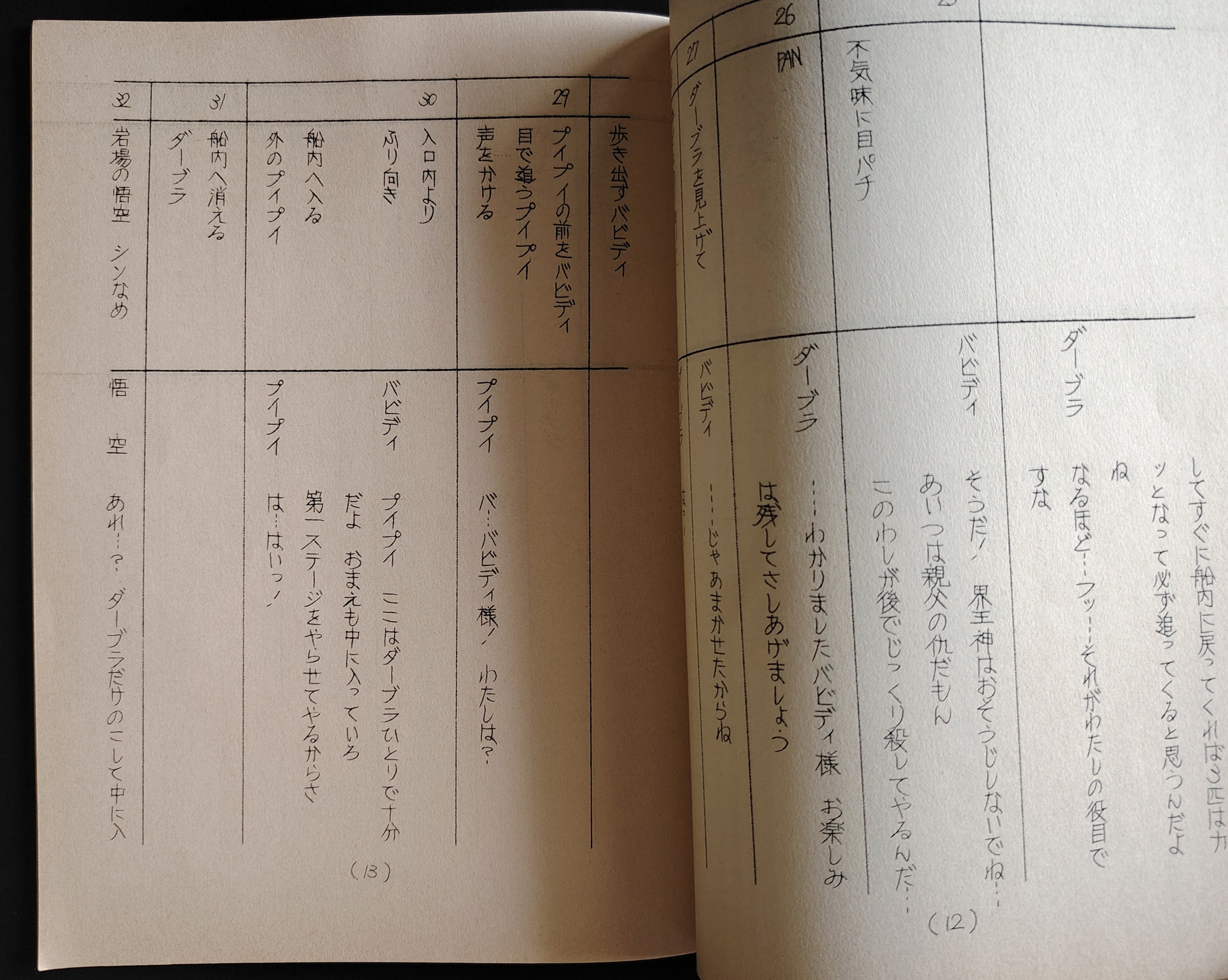 Script original utilisé par un seiyû (comédien de doublage japonais) lors de la réalisation de l'épisode 221 de DRAGON BALL Z en 1994. Titre de l'épisode : Le piège qui vous attend ! Un défi du royaume des démons 待ち受けるワナ!!魔界からの挑戦状 ! Réalisateur : Kazuhito Kikuchi.