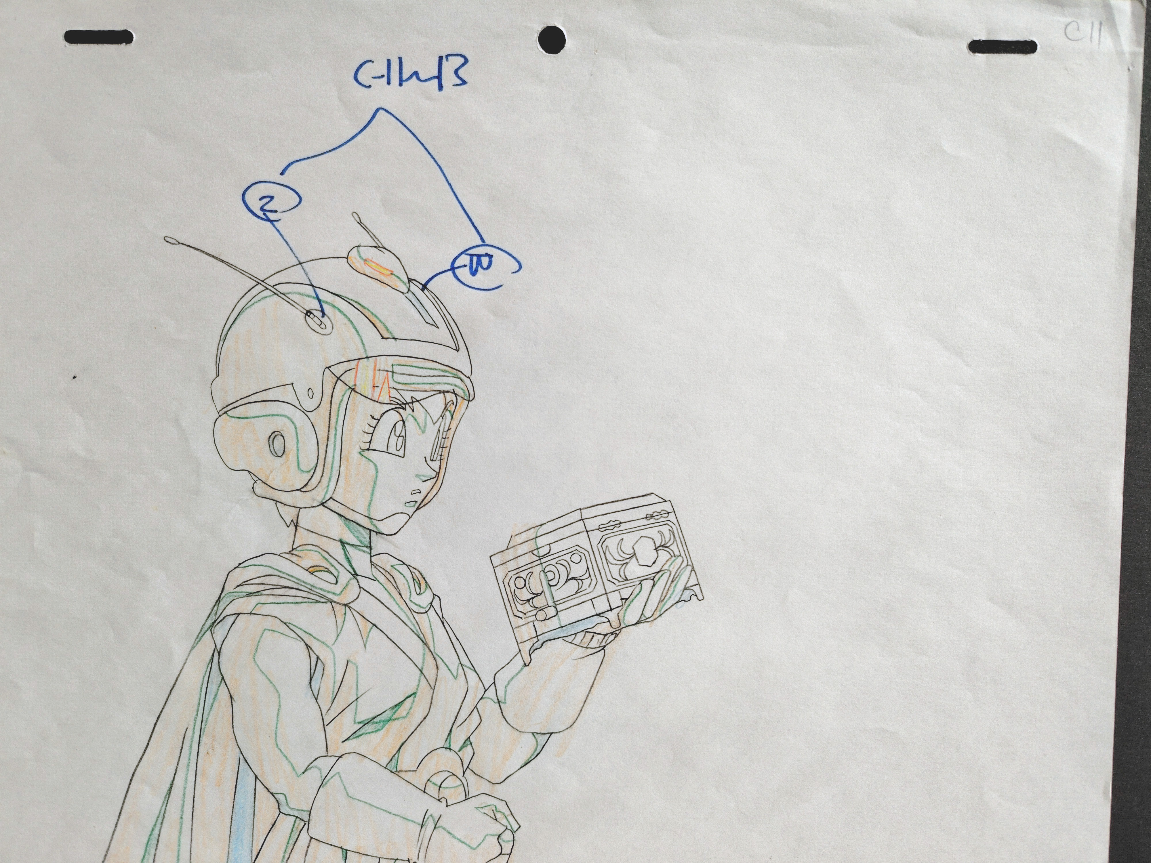 DOUGA original DRAGON BALL Z à la mine de plomb et au crayon de couleur représentant Videl en tenue de Great Saiyaman 2 tenant la boîte à musique renfermant Tapion tiré du film 13 "L'attaque du Dragon", "L’Explosion du poing du dragon !! Si Goku n’y arrive pas, qui le pourra ?", "ドラゴンボールZ 龍拳爆発!!悟空がやらねば誰がやる" sortie en 1995 par la Toei animation.