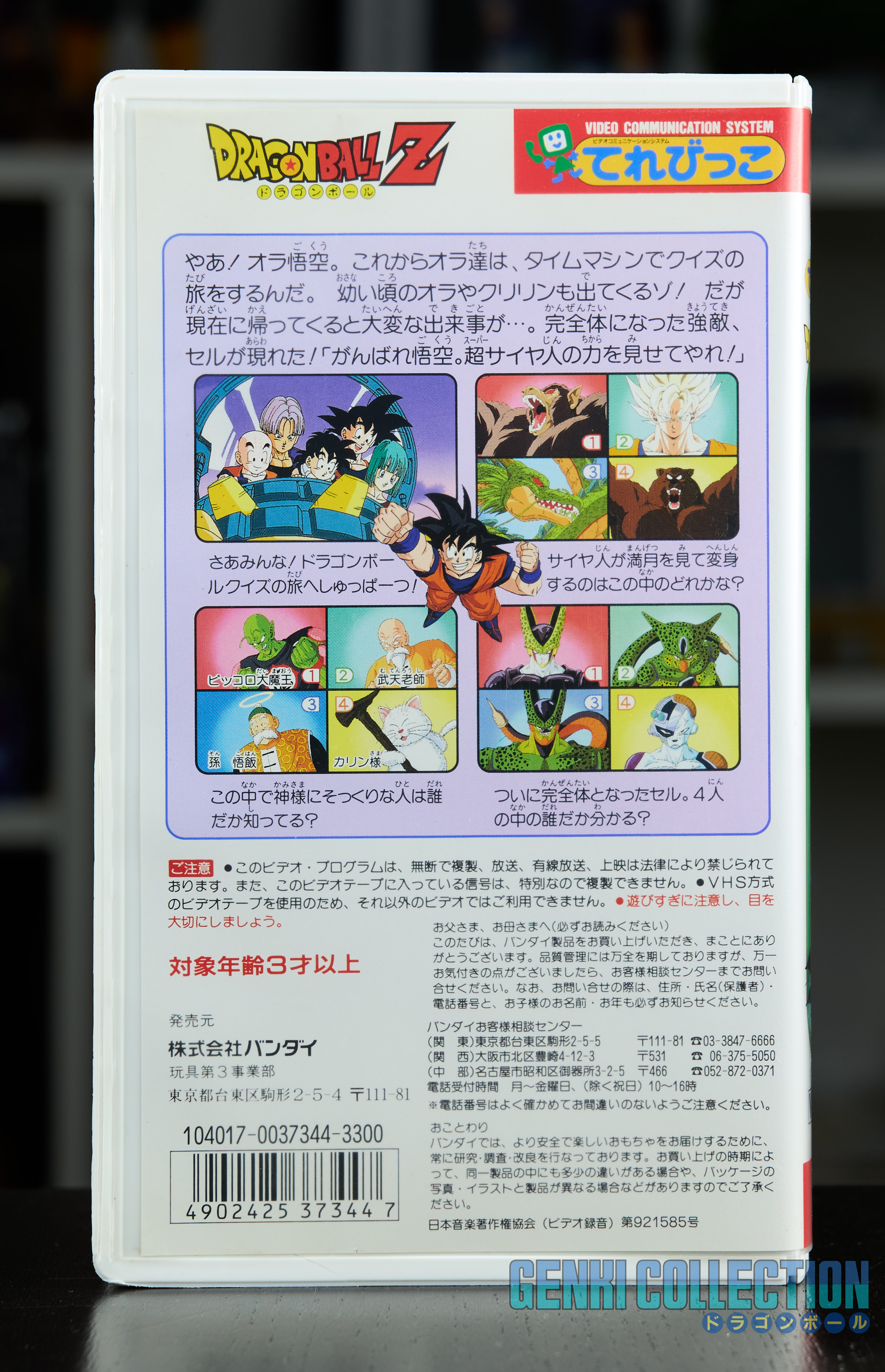 VHS très rare de l'OAV DRAGON BALL Z "Atsumare ! Gokû World", sortie en 1992 et destinée à accompagner un "téléphone interactif" nommé "Terebikko" qui sonne afin de permettre d'entendre le protagoniste de la VHS poser une question sur la série DRAGON BALL, pour laquelle il est possible de choisir une réponse parmi les 4 choix proposés à l'écran. Il est tout à fait possible de visionner la VHS sans téléphone. Excellent état avec Registered Card.