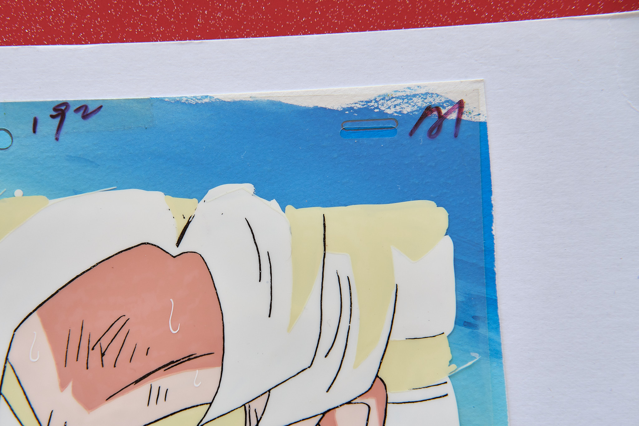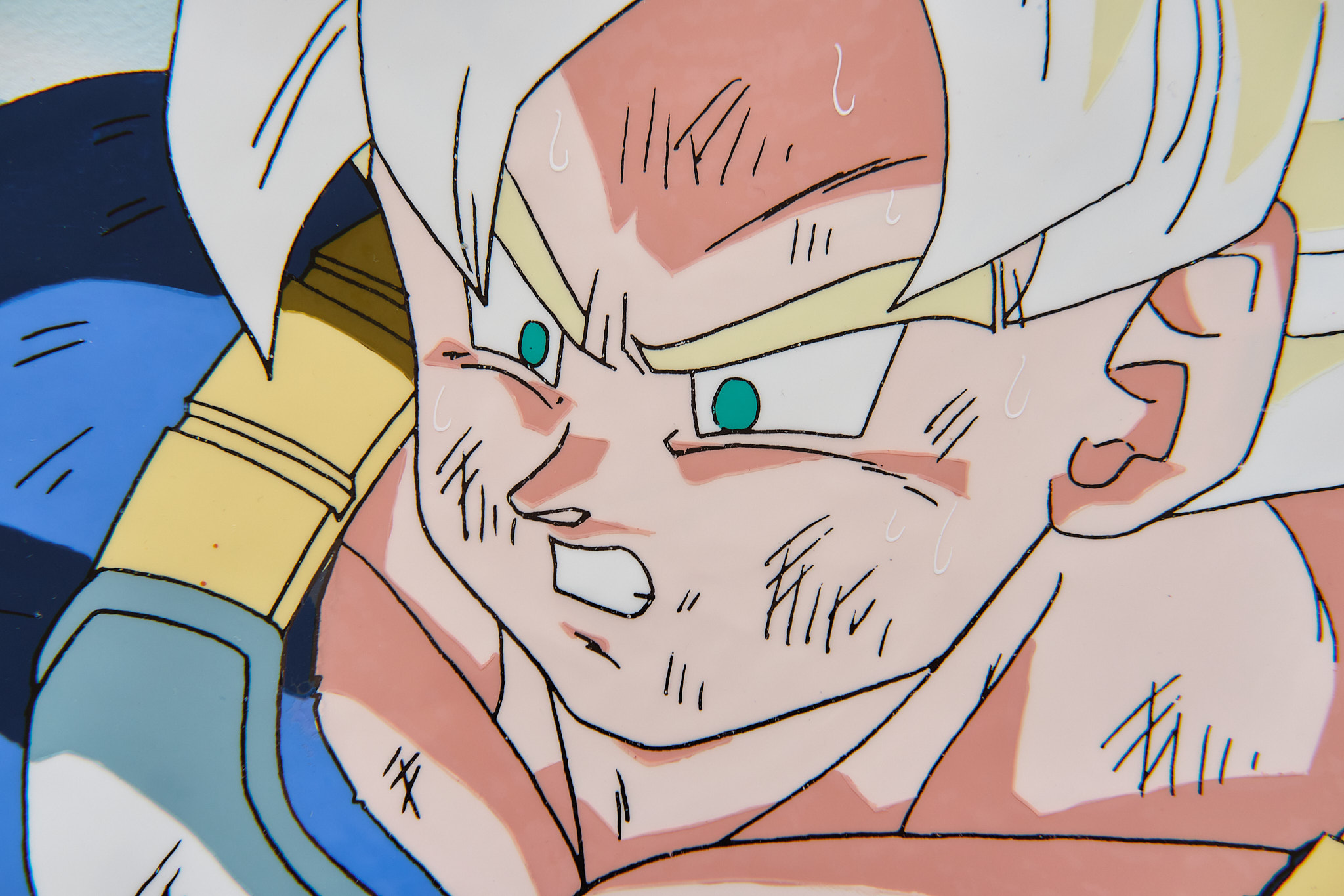 CELLULO A1 Gokû Super Saiyan en armure Saiyan + Décor original DRAGON BALL Z EP 187.Cellulo peinture acrylique de DRAGON BALL Z au format standard (26,5x22,8cm) de Gokû Super Saiyan en armure Saiyan et son décor peint à la main (probablement le bon utlisé dans la séquence, mais celui-ci est collé au cellulo). Le douga (crayonné préparatoire) est également présent. Cette séquence a été supposément réalisée pour l'épisode 187 de DRAGON BALL Z, séquence clé A1 mais à priori non utilisé dans l'anime, la séquence commence à A2.