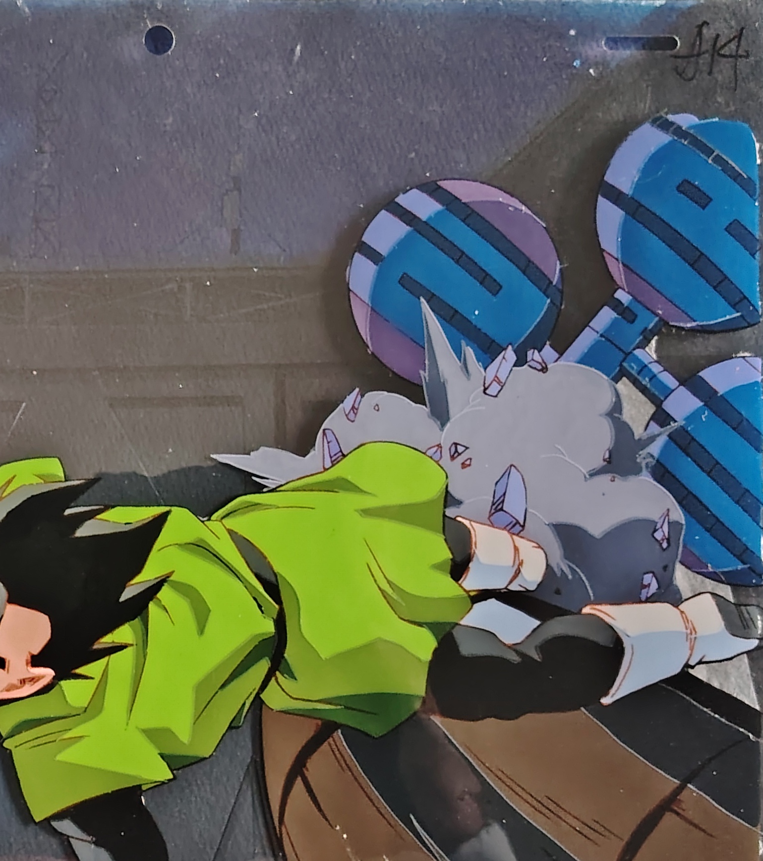 Cellulo original DRAGON BALL Z à l’encre et à la gouache représentant Gohan Ultime avec un décor gouaché "non matching" et non collé. Scène tirée du film 13 "L'attaque du Dragon", "L’Explosion du poing du dragon !! Si Goku n’y arrive pas, qui le pourra ?", "ラゴンボールZ 龍拳爆発!!悟空がやらねば誰がやる", produit en 1995 par Toei Animation. Le décor provient de la serie 801 T.T.S. Airbats.