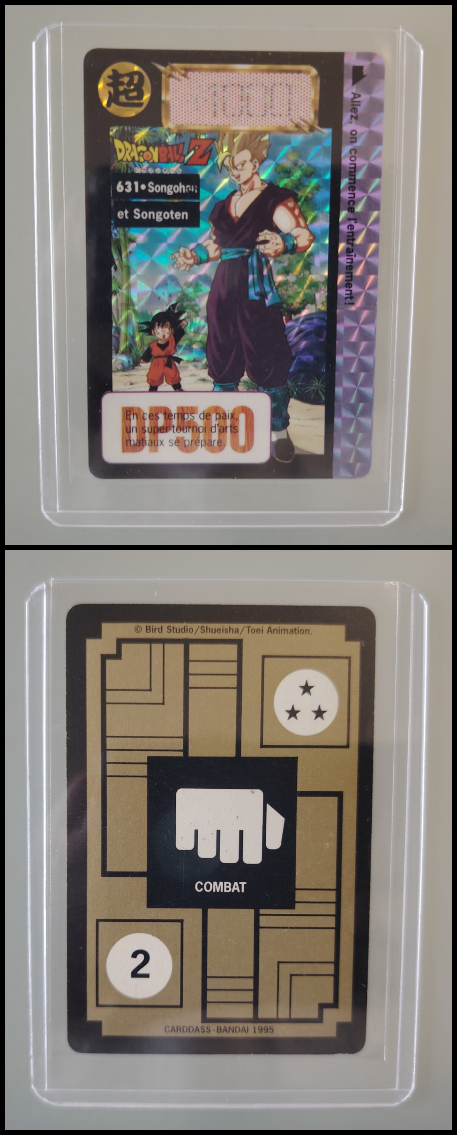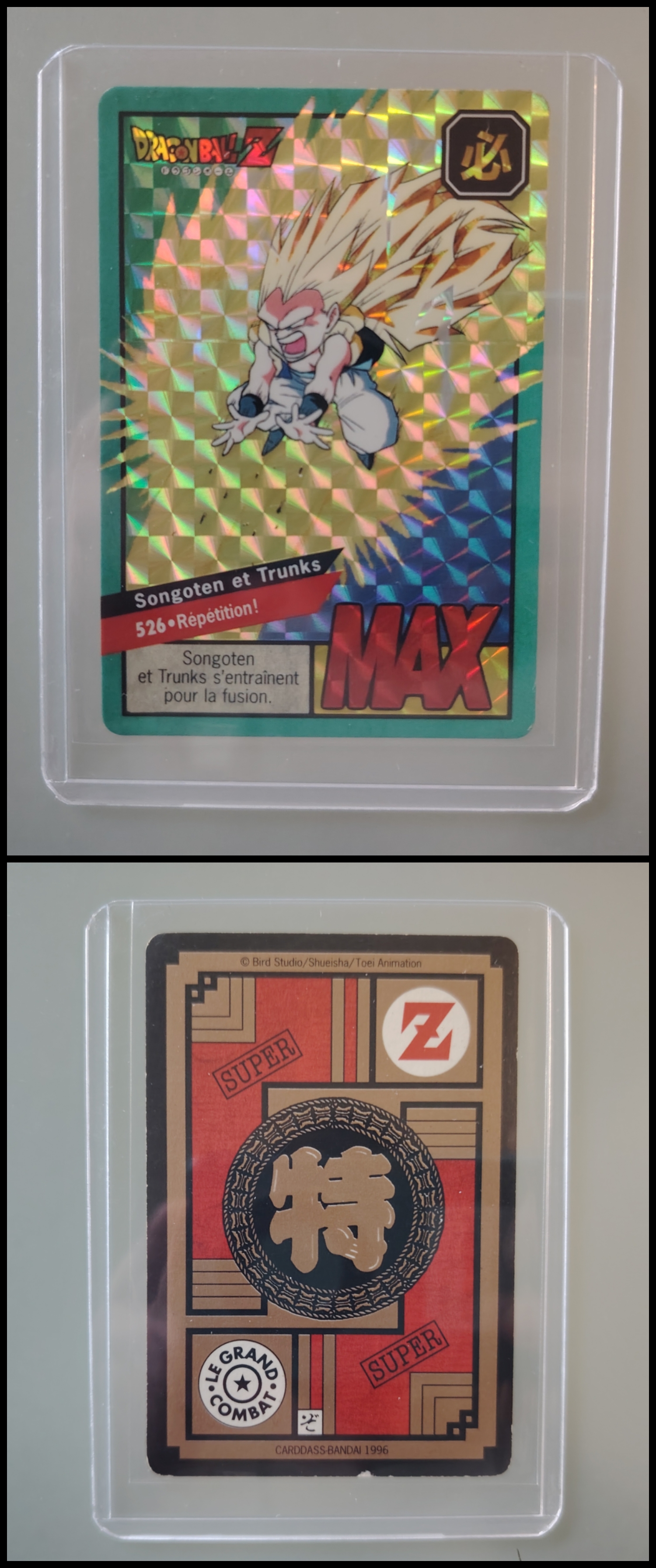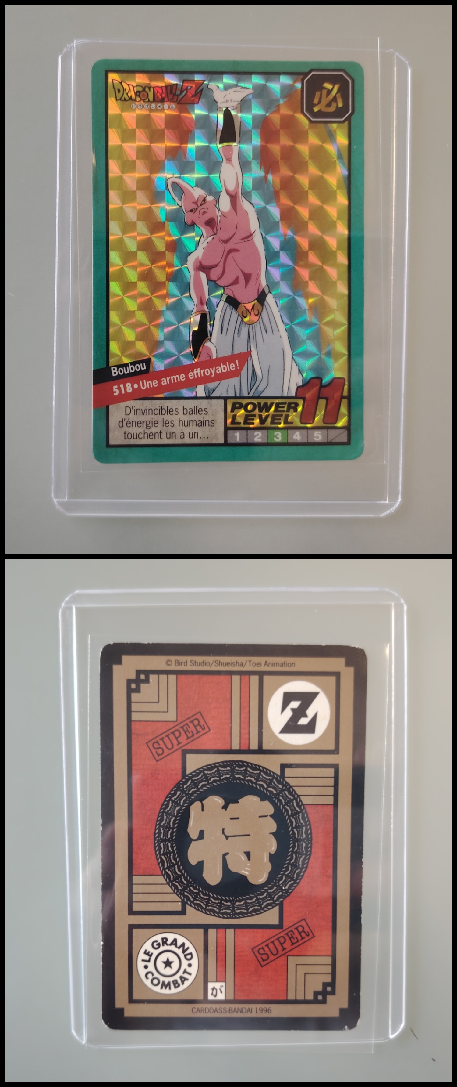 Lot de 247 cartes des séries françaises Carddass et Le Grand Combat (1995 à 1998) + 7 boosters vides + 1 classeur + 1 pocket box + 1 mini classeur, dont voici le détail : - Lot de 36 cartes Carddass Hondan part 16 : HS, 1, 2, 3, 4, Héro : 1, 2, 3, 4, 5, 6, 7, 8, 9, 620, 622, 623, 624, 626, 627, 628, 631 (prism), 632 (prism), 633, 634, 635, 636, 637, 638, 639, 640, 641, 642, 643, 644, 645, année 1995. - Lot de 34 cartes Carddass Hondan part 17 : 5, 6, 7, 9, 10, 12, 13, 14, 15, 16, 18, 19, 20, 21, 22, 23, 24, 25, 26, 27, 28, 29, 30, 31, 32, 33, 34,35, 37, 38 (prism état moyen), 39, 40, 41, 42, année 1995. - Lot de 34 cartes Carddass Hondan part 20 : 127, 128, 129, 131, 132, 133, 134, 135, 136, 137, 138, 139, 140, 141, 142, 144, 145, 146, 147, 148, 149, 150, 152, 153, 156, 157, 158, 160, 161, 162, 163, 164, 165, 166 Année 1996. - Lot de 32 cartes Le Grand Combat part 2 : 485 (Prism), 486, 487, 488, 489, 490, 494, 2 cartes 496 (double prism + face B), 497, 499, 501, 502, 504 507 (prism face B), 508, 509, 511, 512, 514, 515, 516, 517, 518 (prism état moyen), 520, 521, 522, 523, 524, 525, 526 (prism face B état Moyen), 528, année 1996. - Lot de 6 cartes Le Grand Combat part 3 : 540 (Prism), 551(Prism face B), 531, 555, 566, 572, année 1996. - Lot de 25 cartes Le Grand Combat part 4 : HS (état moyen), 575, 576, 578, 580, 582, 583, 586, 587 Prism (Face A / B décollées), 588, 590, 591, 592, 595 (Prism), 599, 601, 604, 606 (Prism), 607, 608, 610, 611, 614, 616, année 1996. - Lot de 10 cartes Le Grand Combat part 5 : 630, 633, 638, 642, 643, 646, 649, 651, 654, 656, année 1996. - Lot de 9 cartes Le Grand Combat part 6 : 668, 677, 684, 686, 688, 691, 693, 698, 703, année 1997. - Lot de 14 cartes part 7 : 710, 711, 712, 717, 721, 722, 723, 728, 729, 735, 736, 740, 746, 747, année 1997. - Lot de 36 cartes Le Grand Combat part 8 : 750, 751, 752, 753, 754, 755, 756, 757, 759, 761, 762, 763, 765, 766, 767, 768, 769, 772, 773, 774, 775, 776, 777 (Hidden Prism), 778, 779, 780, 781, 783, 784, 785, 786, 787, 788, 789, 791, 792, année 1998. - Lot de 11 cartes Le Grand Combat part 9 : 808, 809, 810, 812, 816, 823, 824, 825, 828, 831, 834, année 1998. - Lot de 7 boosters vides Carddass Hondan part 2, 4, 5, 6, 7, 9. - 1 Classeur avec 6 feuilles de rangement de la part 5 de 1996. - 1 boîte pocket Carddass. - 1 mini classeur dépliants. État : Bon état général sauf si mention, chaque cartes est protégées dans une sleeve + toploader. Ce dernier peut éventuellement avoir des traces ou des micros poussières. Veuillez consulter la vidéo pour avoir davantage de visuels, n'hésitez pas a me contacter si vous avez besoin de photos complémentaires.