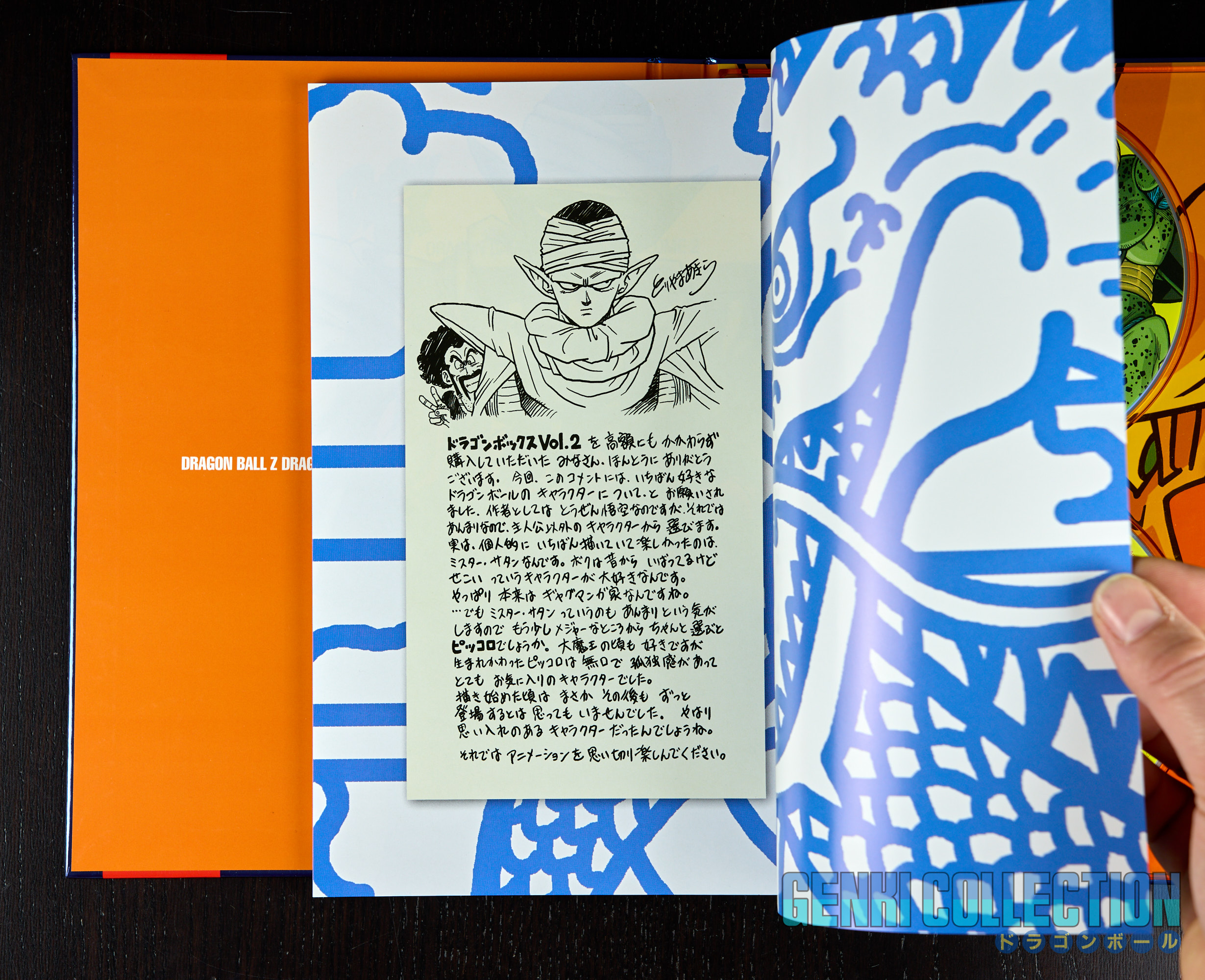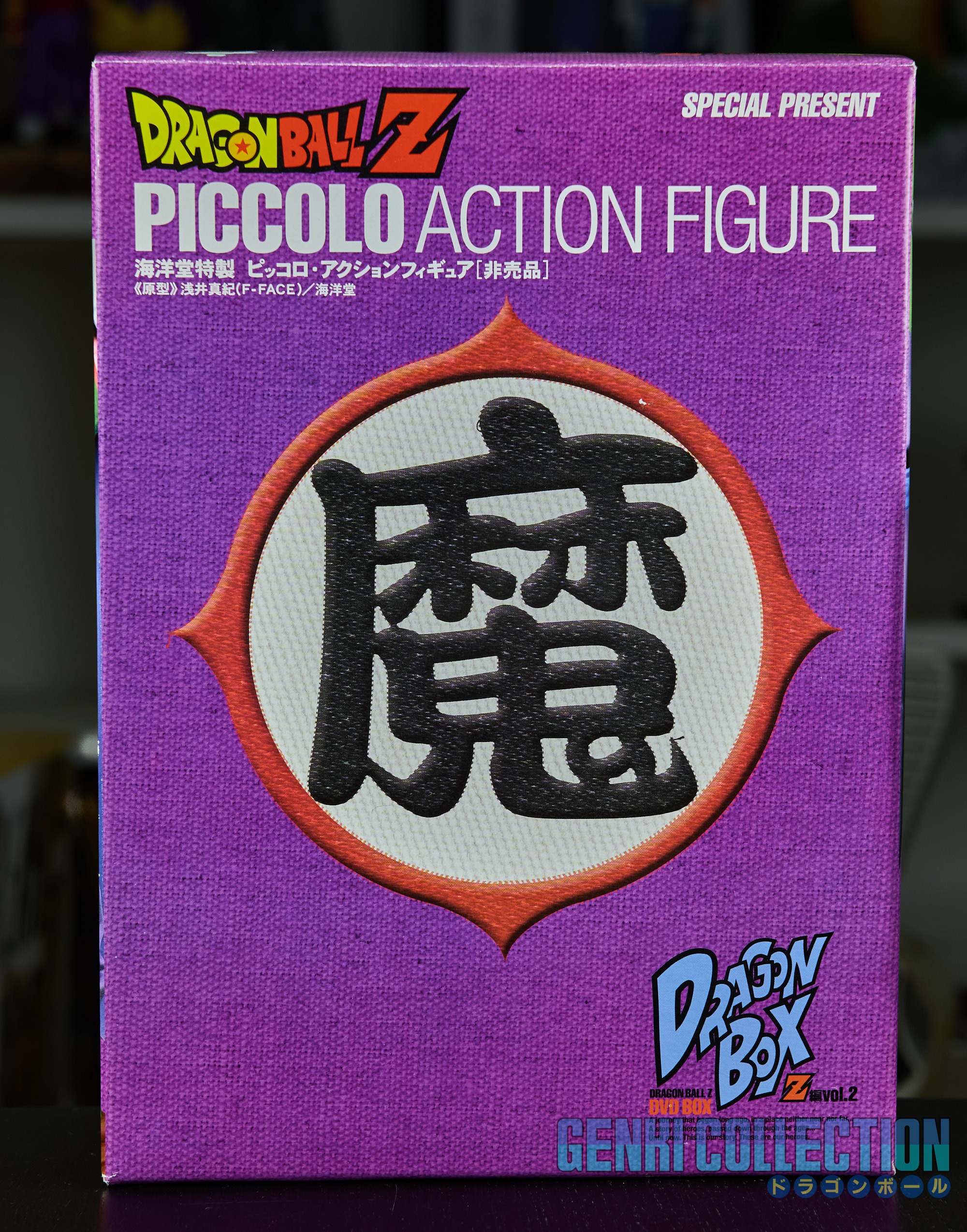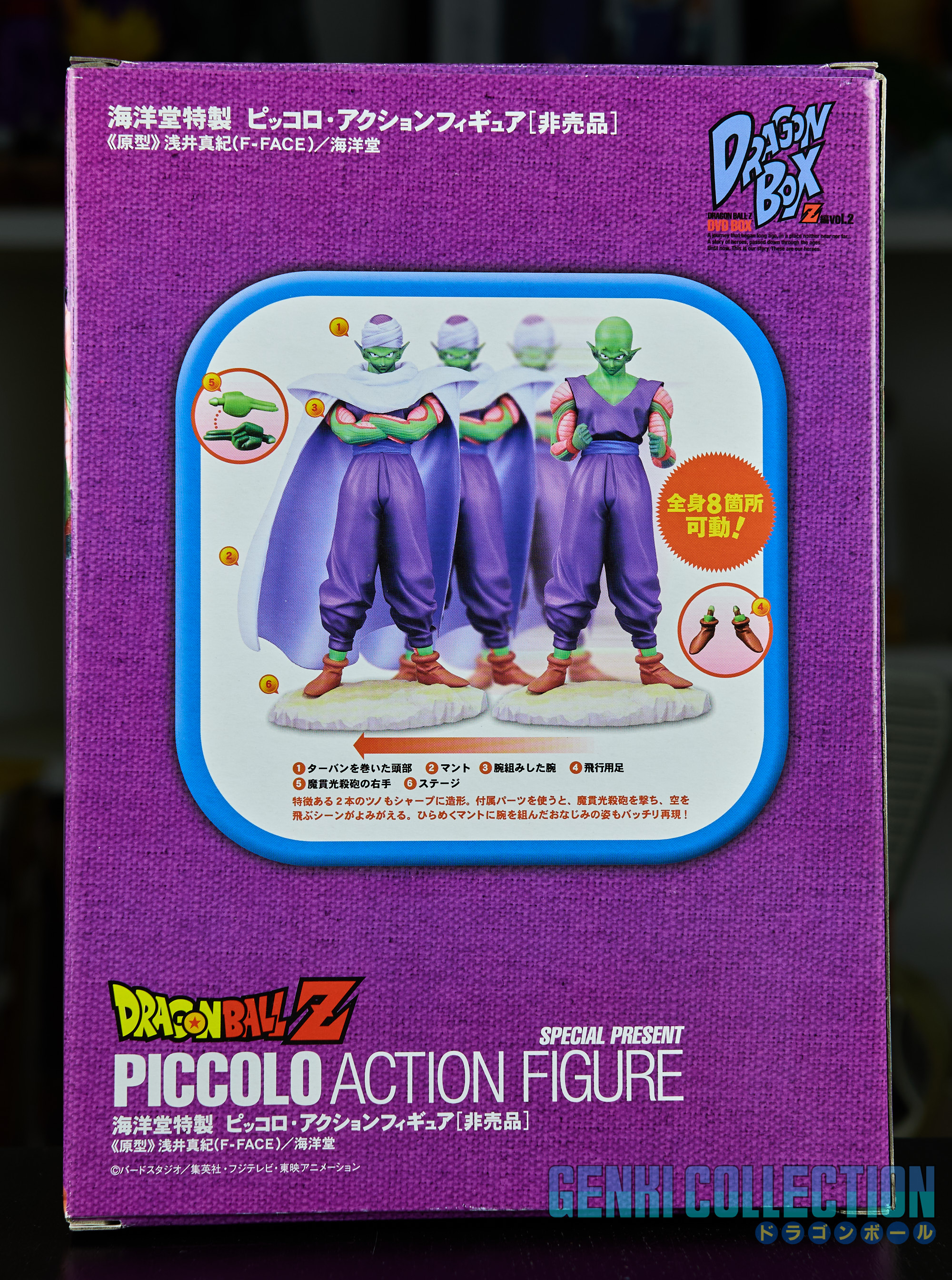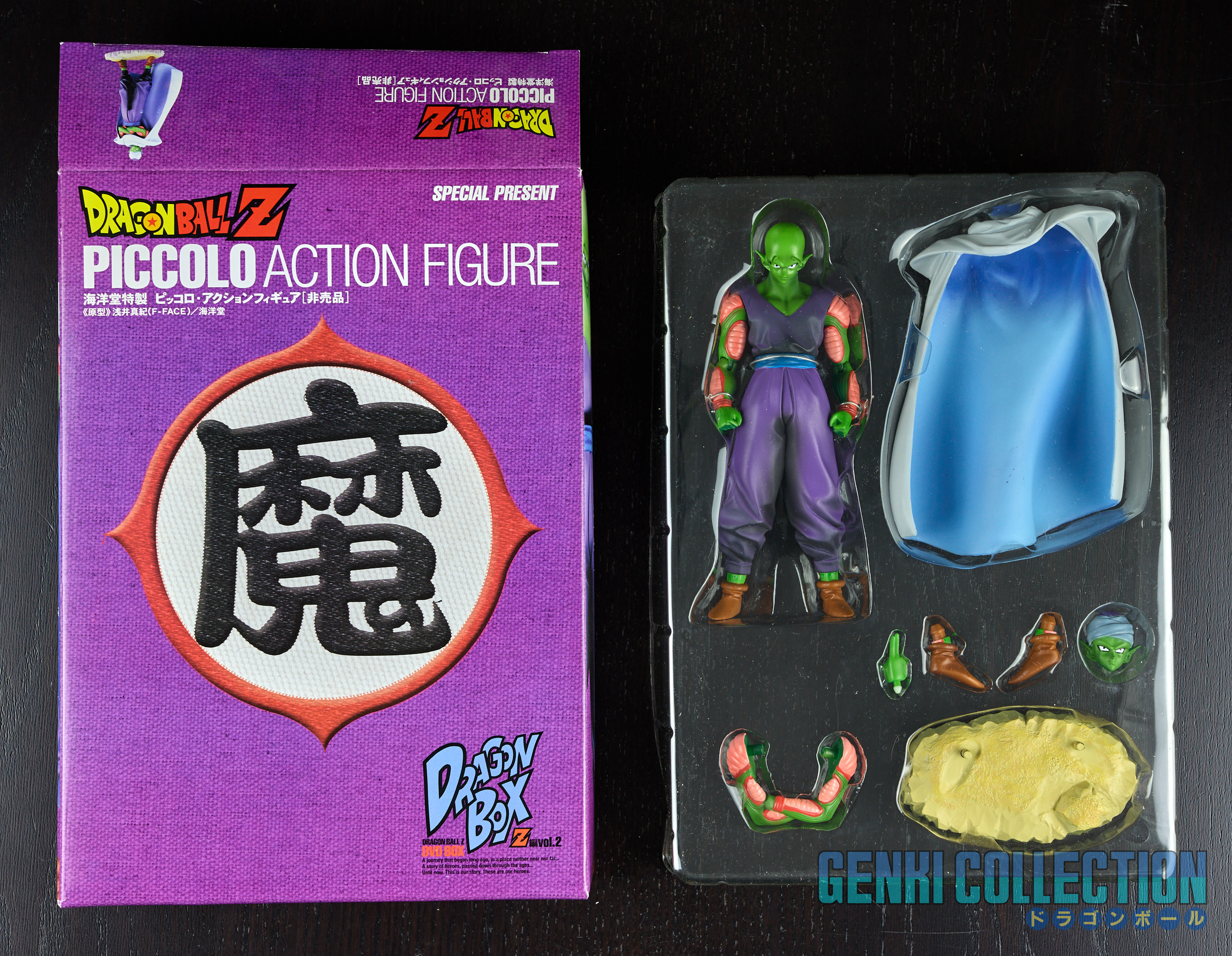 Coffret Dragon Ball Z DVD Box Dragon Box Z Vol. 2 complet avec sur-carton (rare), carton de rangement, Coffret DVD avec fourreaux et figurine exclusive de Son Gokû. Ce magnifique écrin renferme un superbe coffret contenant 7 fourreaux au revêtement bleuté brillant du plus bel effet, eux-même contenant 26 DVD (24 avec les épisodes 148 à 291 de Dragon Ball Z en version originale + 1 DVD contenant le téléfilm de Trunks Story et quelques bonus exclusifs + 1 seconde DVD avec les OAVs Dragon Ball Z Gaiden Saiyajin Zetsumetsu Keikako). L'intérieur de chaque fourreau est protégé par une feuille vierge afin d'éviter le frottement. S'accompagne à cela un très bel artbook avec une préface d'Akira Toriyama, des setteis (croquis préparatoires) de la série, des interviews, des résumés des épisodes et bien d'autres choses. Le coffret est accompagné d'une figurine exclusive de Piccolo, designée par Kaiyodo et non disponible à la vente en circuit classique. Celle-ci possède 2 têtes interchangeables, une cape amovible, ainsi que des bras et une main supplémentaire. Tout est en excellent état.