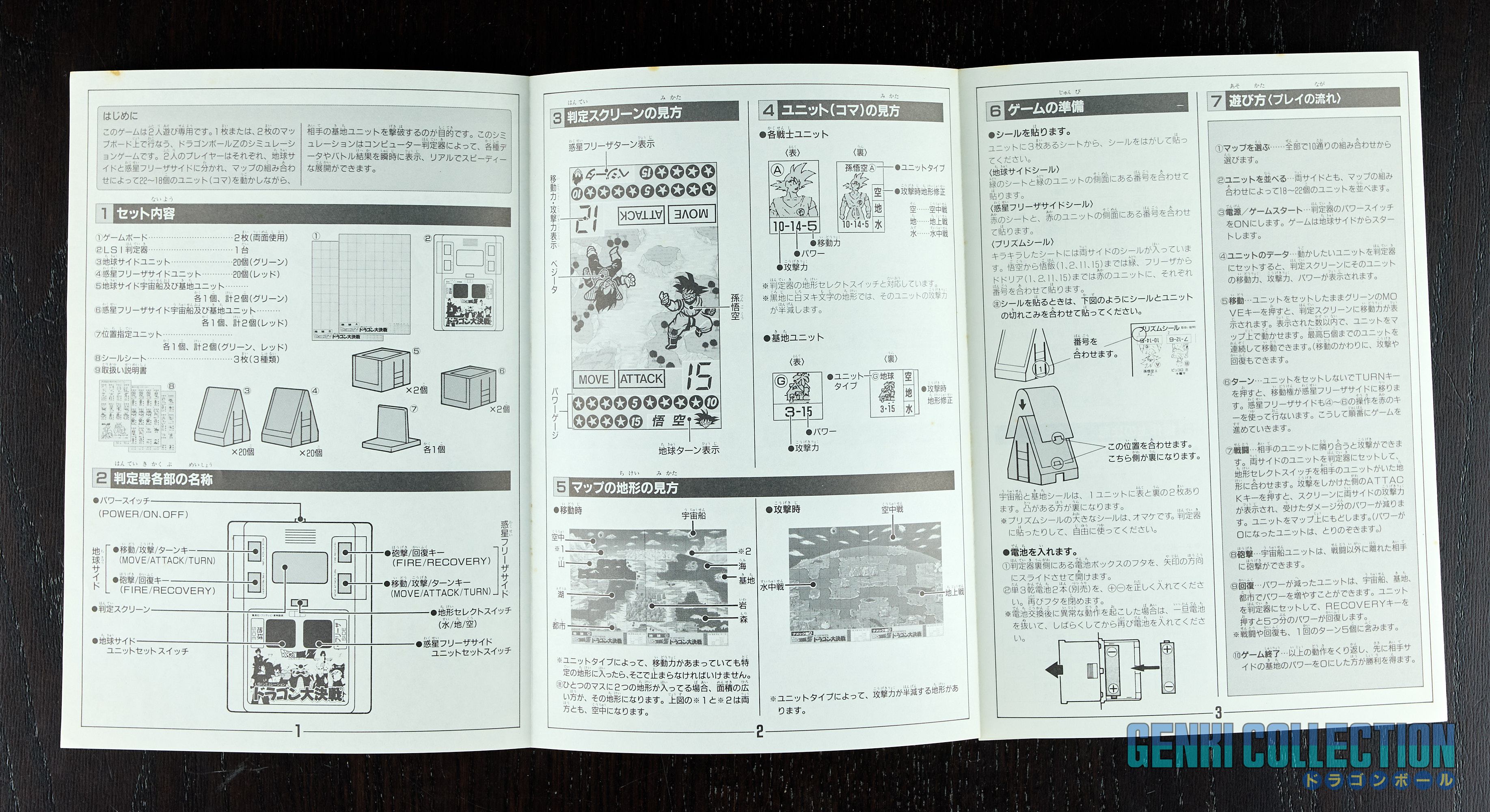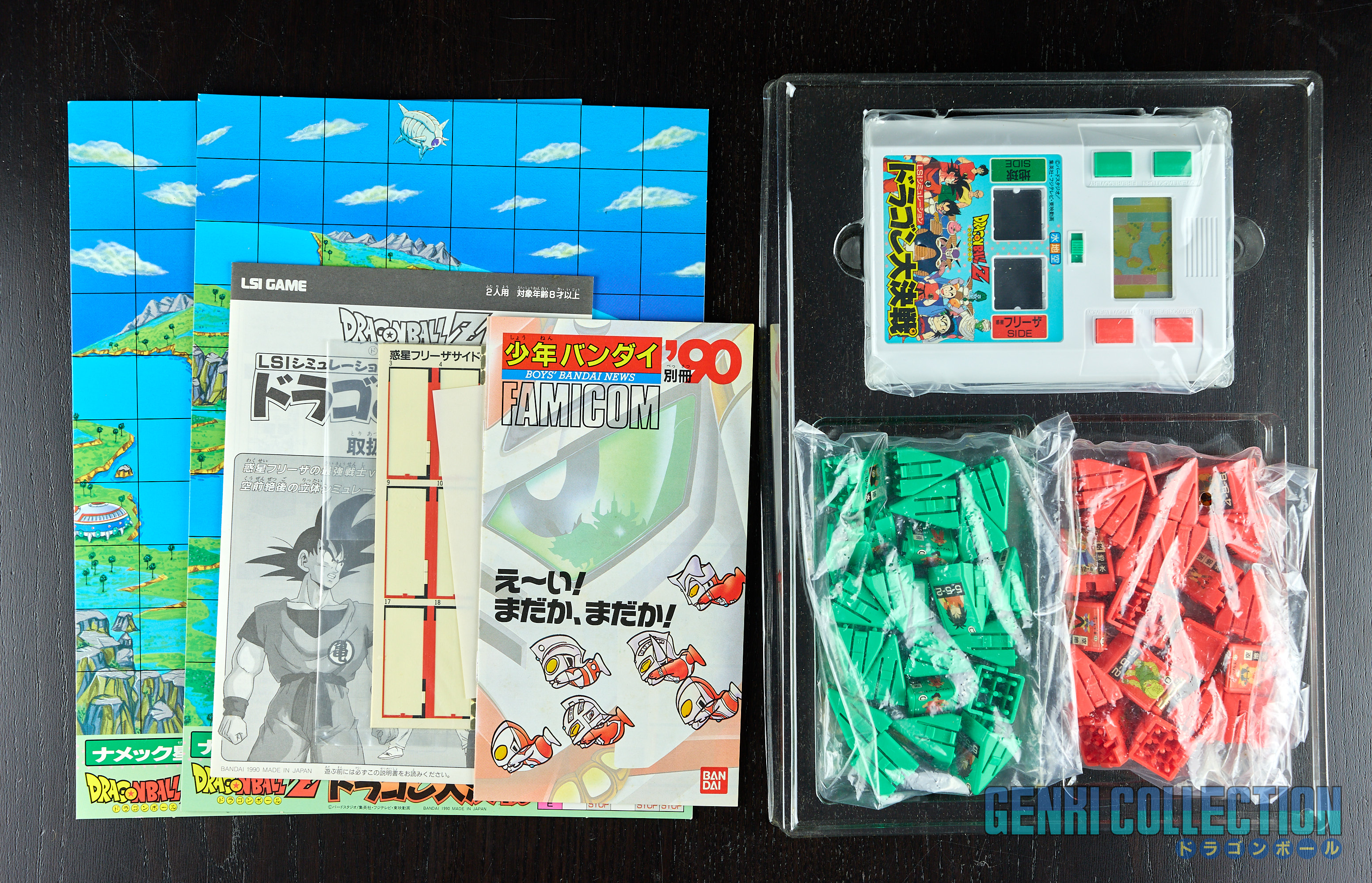Jeu de plateau électronique Dragon Ball Z datant de 1990 et édité par Bandai, Dragon Dai Kessen. Jeu complet avec notice, pions, flyer publicitaire et appareil électronique fonctionnel avec deux piles AAA (LR3, non fournies), les autocollants ont été collés sur les pions. Très bon état général, excepté la boîte qui présente quelques petits défauts esthétiques (légers plis et usure sur les coins).
