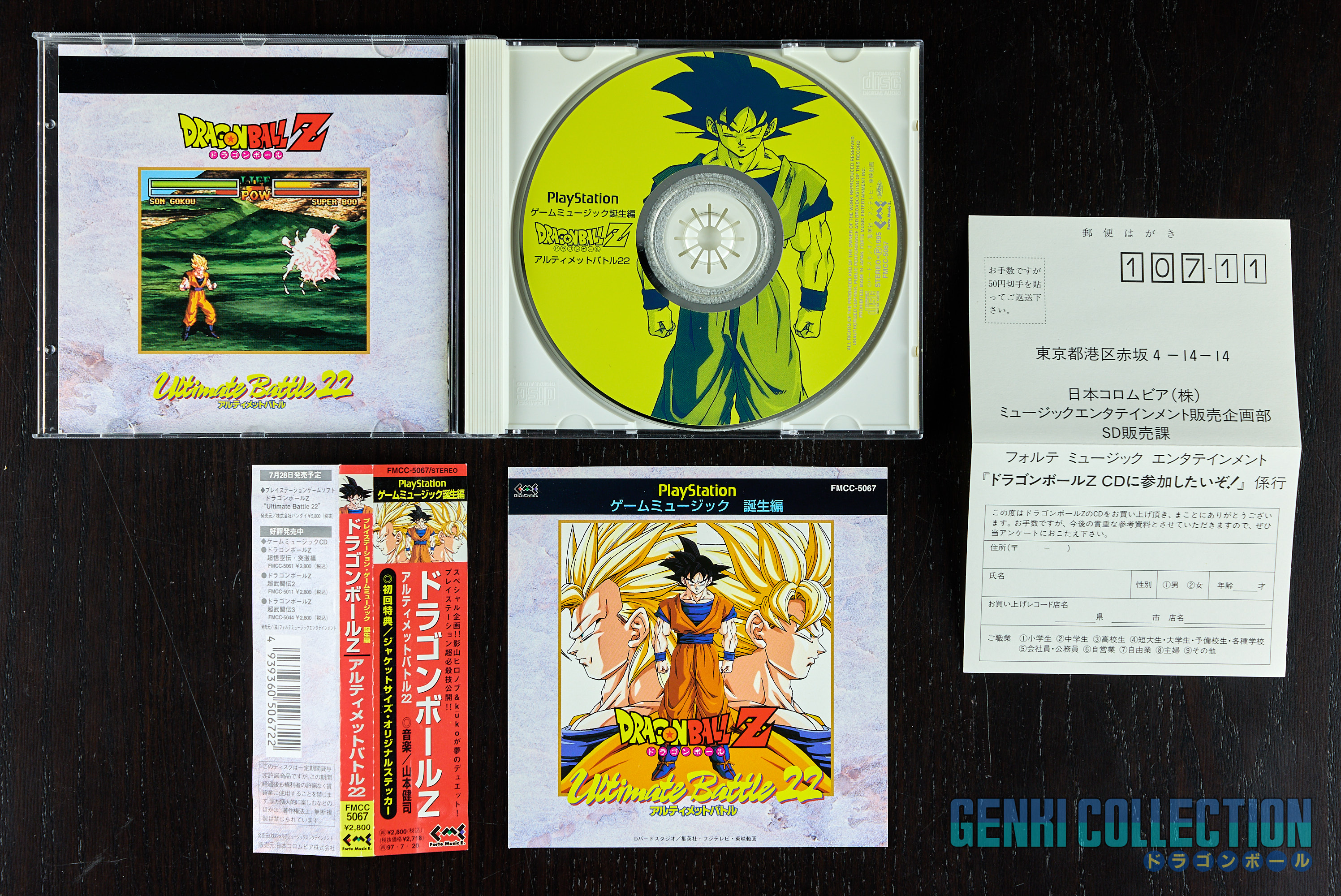 Magnifique set comprenant 20 CD audios Dragon Ball et Dragon Ball Z basés sur les jeux vidéos. Tous les albums sont en excellent état, CD non rayés, livrets présents, ainsi que chaque Obi (spine card). Chaque album est protégé sous sleeve. Le set comprend : - Famicom Jump Hero Retsuden (1989 - Pony Canyon) avec posters + sticker prism + sticker de tranches non décollés. - Dragon Ball Z Gaiden Saiyajin Zetsumetsu Keikaku (1993 - Forte Muscic Entertainment) avec illustration en noir et blanc inédite. - Dragon Ball Z Super Butôden (1993 - Columbia) avec sticker de la jaquette. - Dragon Ball Z Super Butôden 2 (1993 - Forte Music Entertainment) avec illustration inédite en noir et blanc et sticker de la jaquette. - Dragon Ball Z Super Gokû Den Totsugeki Hen (1995 - Forte Music Entertainment) avec sticker de la jaquette. - Dragon Ball Z Game Music Kakusei Hen (1995 - Columbia) avec sticker de la jaquette. - Dragon Ball Z Game Music Saisei Hen (1996 - Columbia) avec sticker de la jaquette. - Dragon Ball Z Game Music Tanjô Hen Ultimate Battle 22 (1995 - Forte Music Entertainment) avec sticker de la jaquette. - Dragon Ball Z Idainaru Dragon Ball Densetsu (1996 - Columbia) avec sticker de la jaquette. - Dragon Ball Z Final Bout Soundtrack (1997 - Zain Records). - Dragon Ball Z & Z2 Original soundtrack (2005 - Team Entertainment) avec DVD Bonus des coulisses de la réalisation du clip du jeu. Dragon Ball Z3 Ore wa Tokoton Tomaranai!! - Kusuburu Heart ni Hi o Tsukero!! (2005 - Team Entertainment). - Dragon Ball Z 3 Original soundtrack (2005 - Team Entertainment). - Super Survivor (2008 - Lantis). - Dragon Ball Z Burst Limit Original soundtrack (2008 - Lantis). - Dragon Ball Z Infinite World Hikari no Sasu Mirai he! (2008 - Lantis). - Dragon Ball Z Infinite World Original soundtrack (2009 - Lantis). - Dragon Ball Power of Dreamer (2009 - Lantis). - Dragon Ball Raging Blast Progression (2009 - Lantis). - Dragon Ball Raging Blast Battle of Omega (2010 - Lantis).