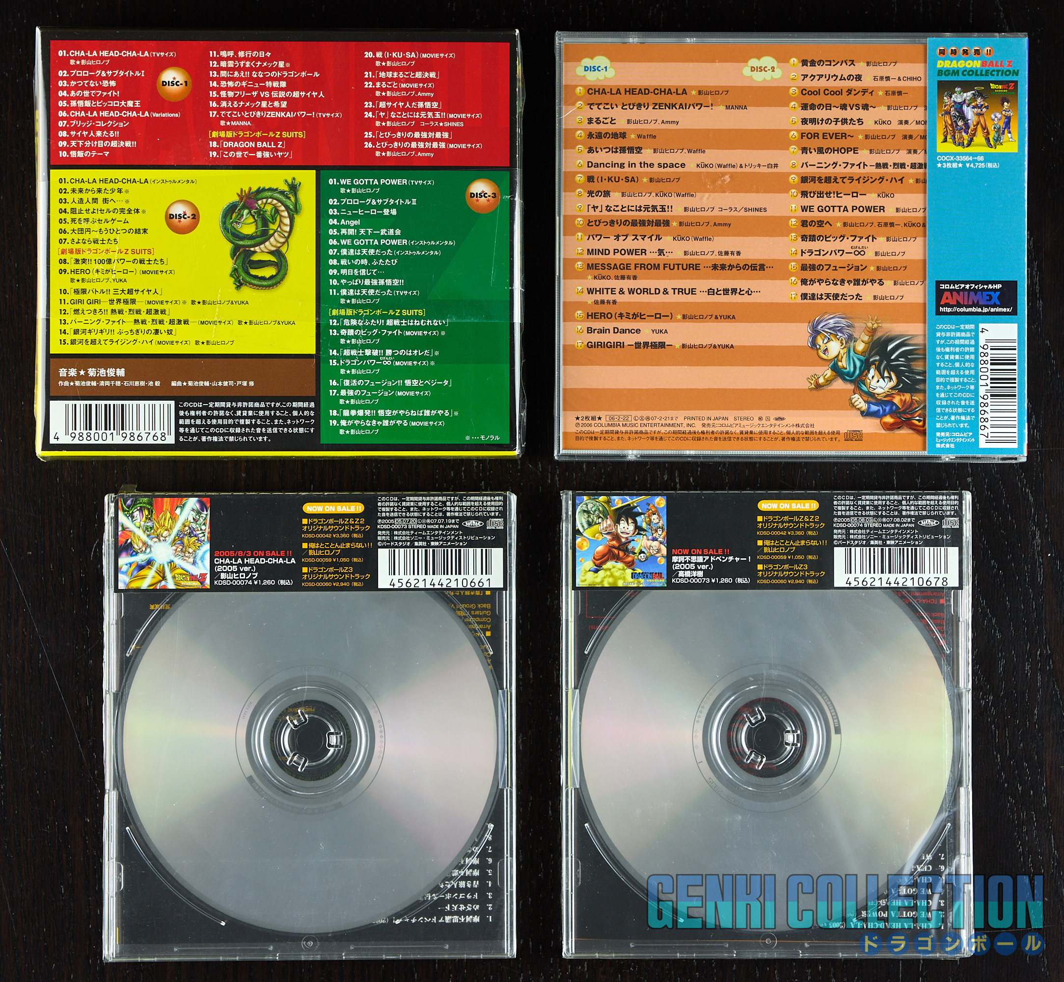 Lot comprenant 4 albums Dragon Ball regroupant les BGM, des compilations de chansons et les remix de 2005, tous en parfait état avec Obi, dont voici le détail : - Dragon Ball BGM Collection 3 discs (2006 - Columbia). - Dragon Ball Best Song Collection Legend of Dragon World 2 discs (2006 - Columbia). - Dragon Ball Makafushigi Adventure! (2005 ver.) (2005 - Team Entertainment). - Dragon Ball Cha-La Head-Cha-La (2005 ver.) (2005 - Team Entertainment).