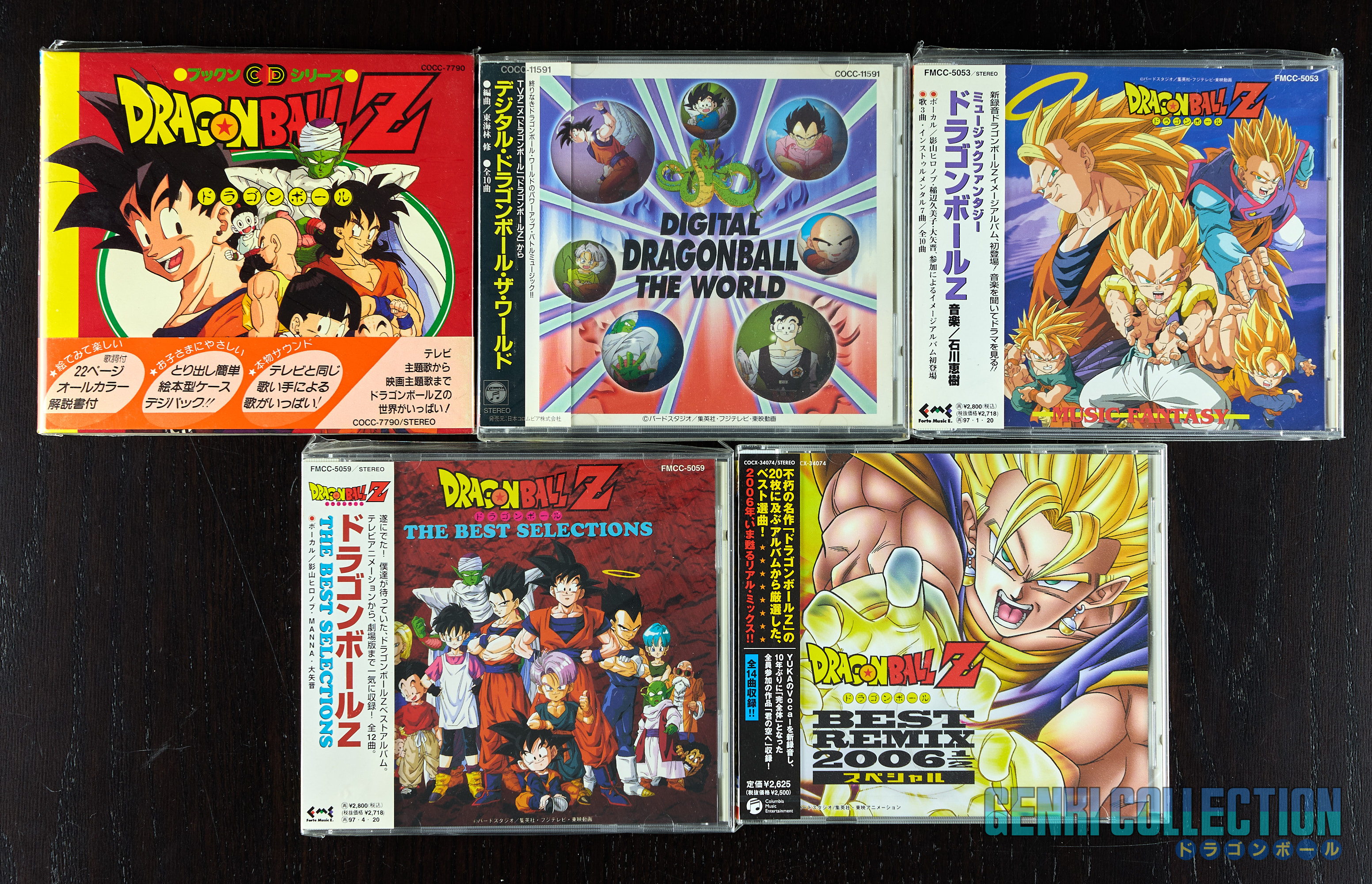 Lot comprenant 5 albums + 1 coffret de sélections musicales Dragon Ball Z, ainsi que des CD dédiés à des remix, tous en excellent état avec Obi, dont voici le détail : - Dragon Ball Z Book'n CD Series avec couverture rigide (très dur à trouver en très bon état, ce qui est le cas ici) et livret inclus. (1991 - Columbia). - Digital Dragon Ball The World. (1994 - Columbia). - Dragon Ball Z Music Fantasy. (1995 - Forte Music Entretainment). - Dragon Ball Z The Best Selections. (1995 - Forte Music Entretainment). - Dragon Ball Z Hitto Kyokushû BEST "Never Ending Story" 2 discs (1996 - Columbia) - Dragon Ball Z Best Remix 2006½ Special. (2006 - Columbia).