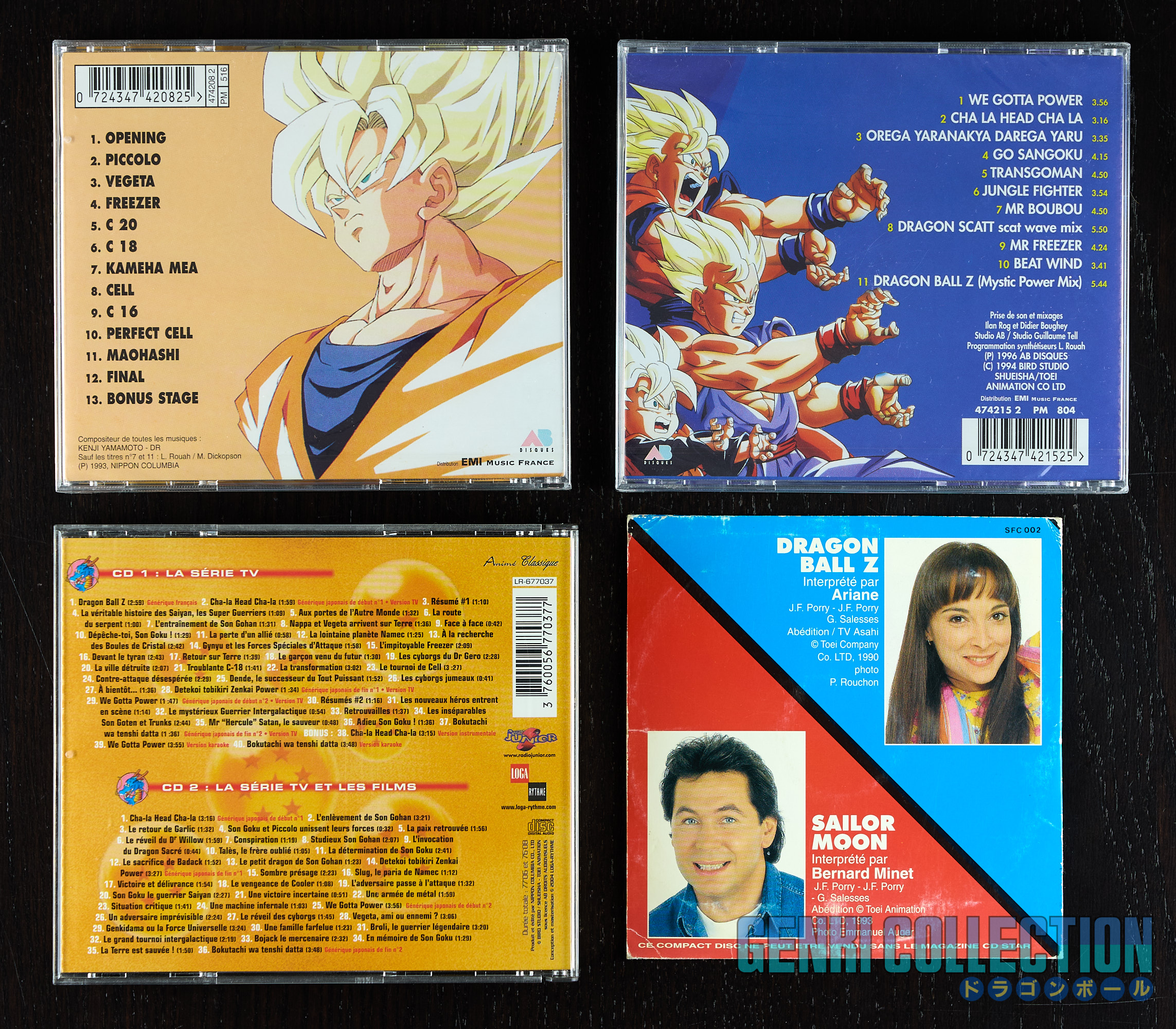 Lot de 4 albums français Dragon Ball Z dont 2 neufs et scellés dont voici le détail : - Dragon Ball Z album remix alternatif de Super Butôden, neuf et scellé (1993 - AB Disques) - Dragon Ball Z We Gotta Power, neuf et scellé (1996 - AB Disques) - Bande originale Dragon Ball Z, 2 disques (2004 - Loga Rythme). - CD 2 titres Dragon Ball Z et Sailor Moon, offert à l'origine dans le premier magazine CD Stars de 1994.