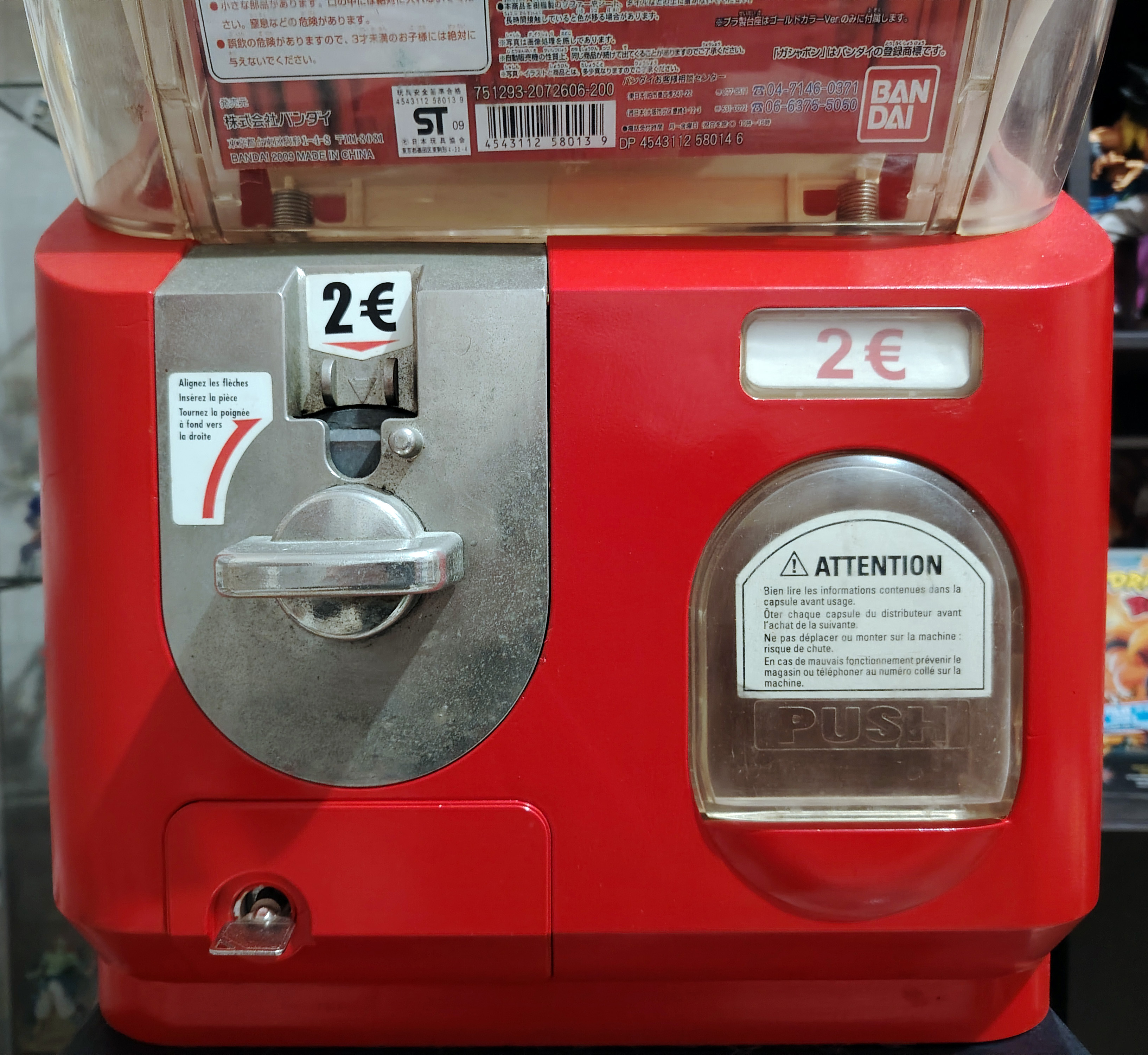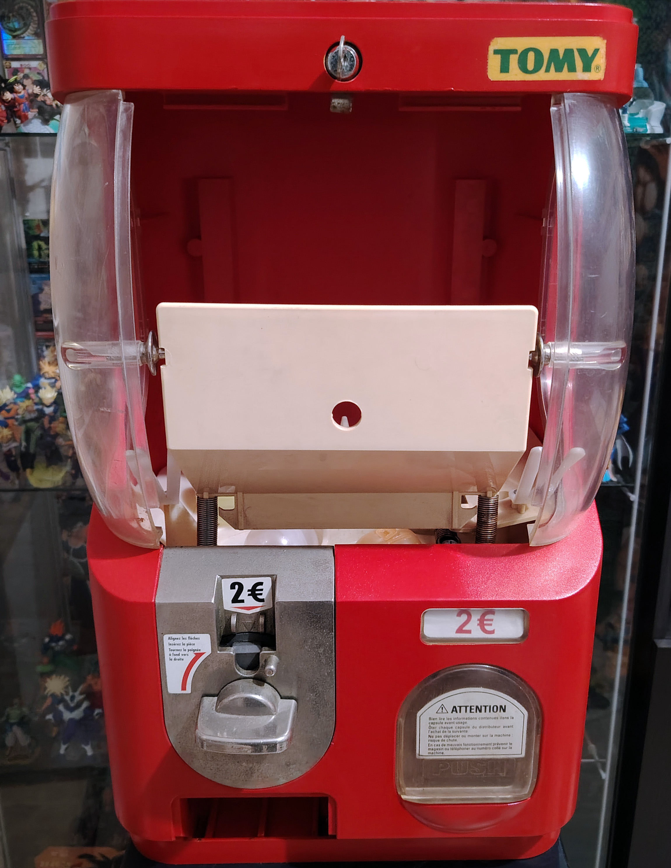 Vending machine (distributeur) à Gashapon Tomy sorti au début des années 2000 et en bon état général. Il est fourni avec 2 clés d'origine ainsi que l'affiche pour la Sortie des Gashapons Dragon Ball Kai HG part 22 + 3 Gashapons de la gamme HG 22 visibles sur l'affiche : Goku, Vegeta, Gohan du futur Super Saiyan, ainsi qu'une boule avec une figurine de Goku et Freezer scellée, une autre boule comprenant Satan et Erasa, et 5 boules vides.