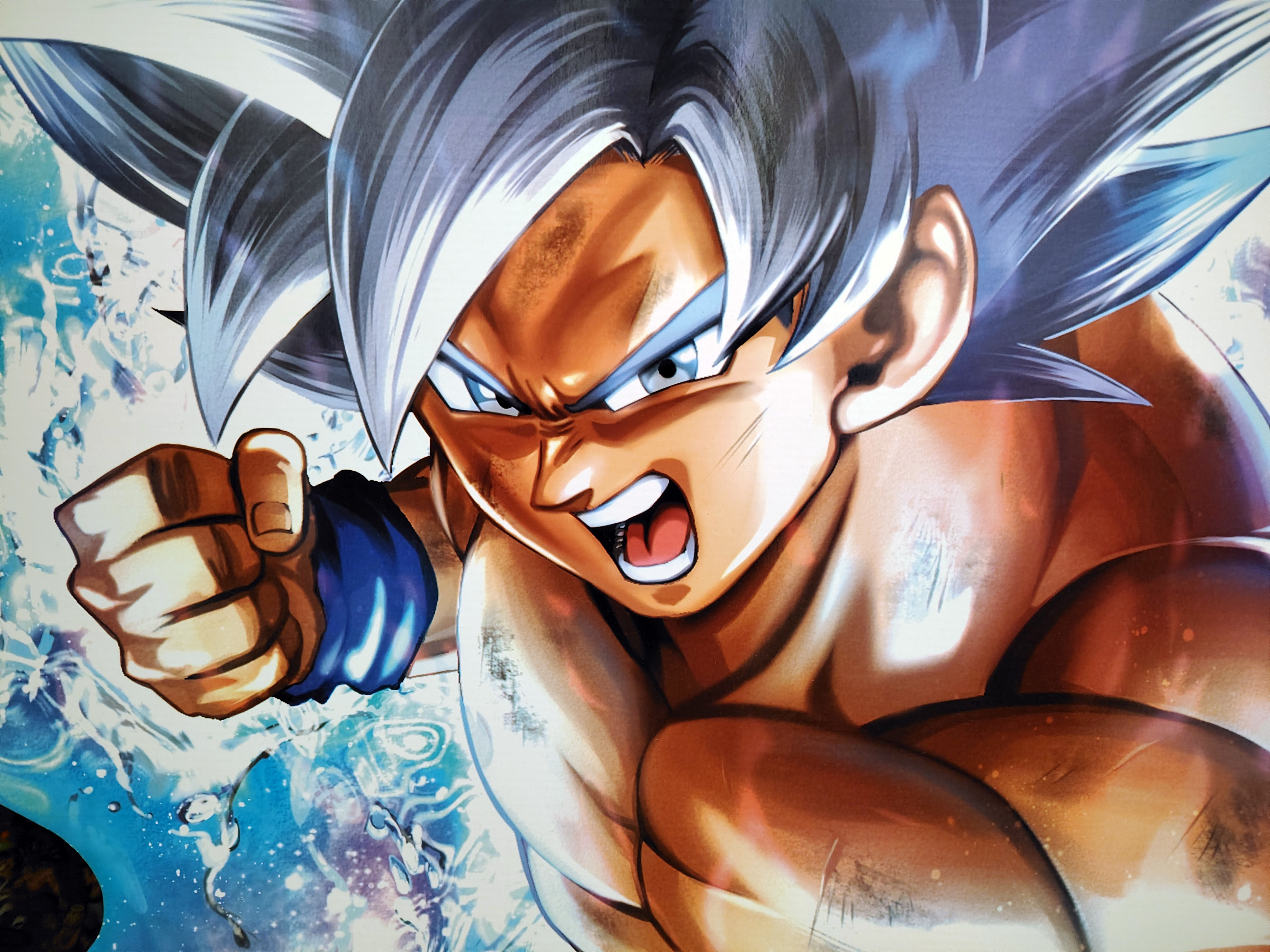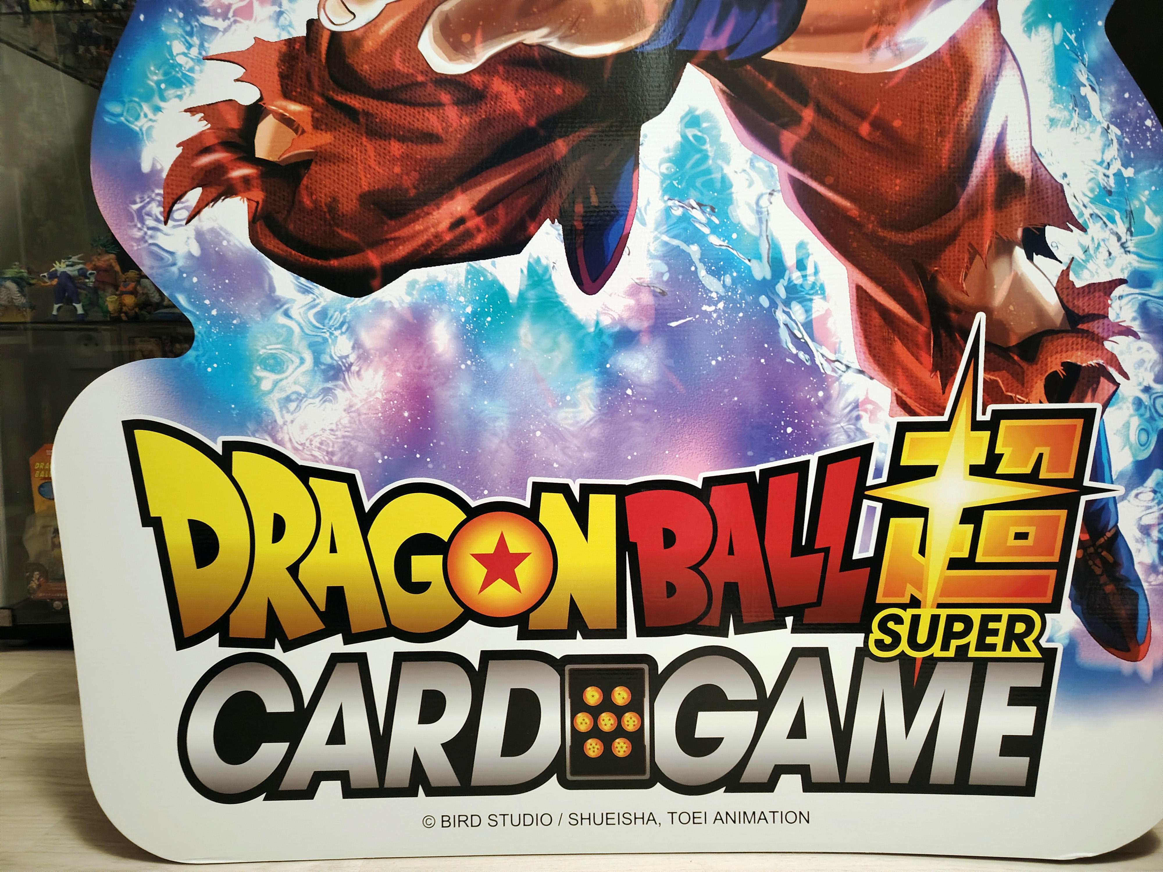 Standing promotionnel (PLV) Dragon Ball Super Card Game représentant Goku Ultra Instinct et mesurant 157 cm de haut et 90 cm de large. Sorti en 2019.