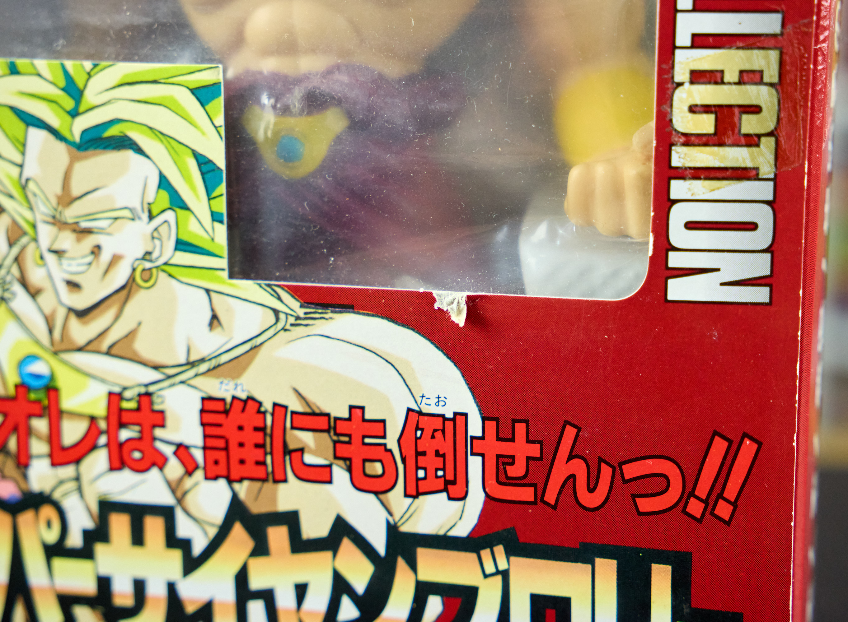 Figurine Super Battle Collection Super Saiyan Broly volume 10. 1ère édition de 1993, Made in China. Modèle particulièrement difficile à trouver, en boîte en bon état, quelques défauts à voir en photos et vidéos. Je pense que la figurine n'a jamais été sortie de son blister intérieur, sans en être certain.