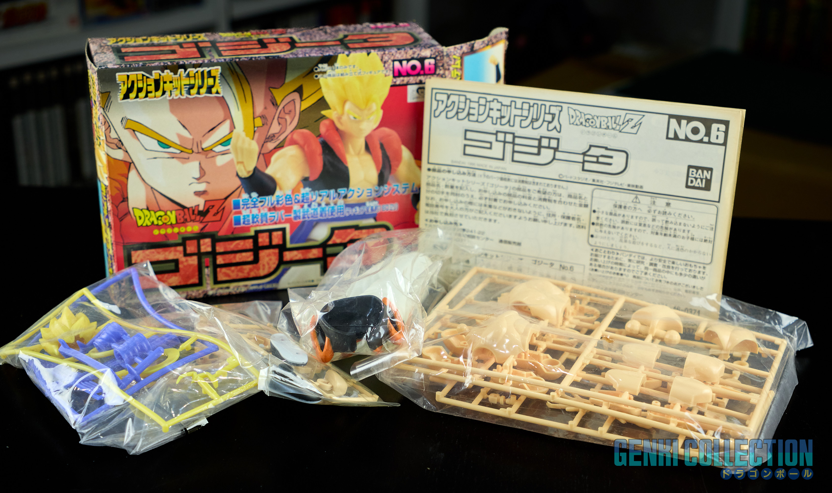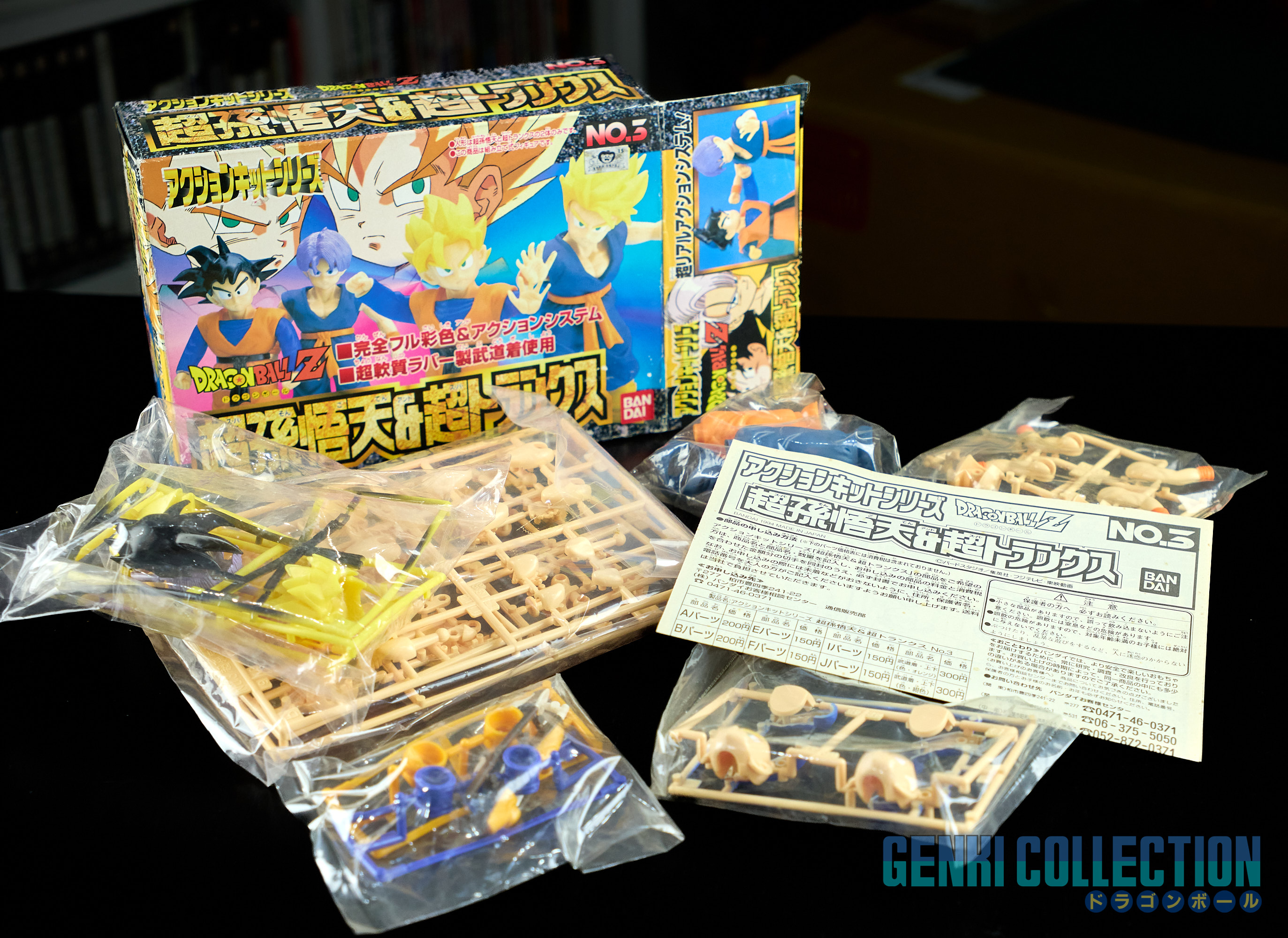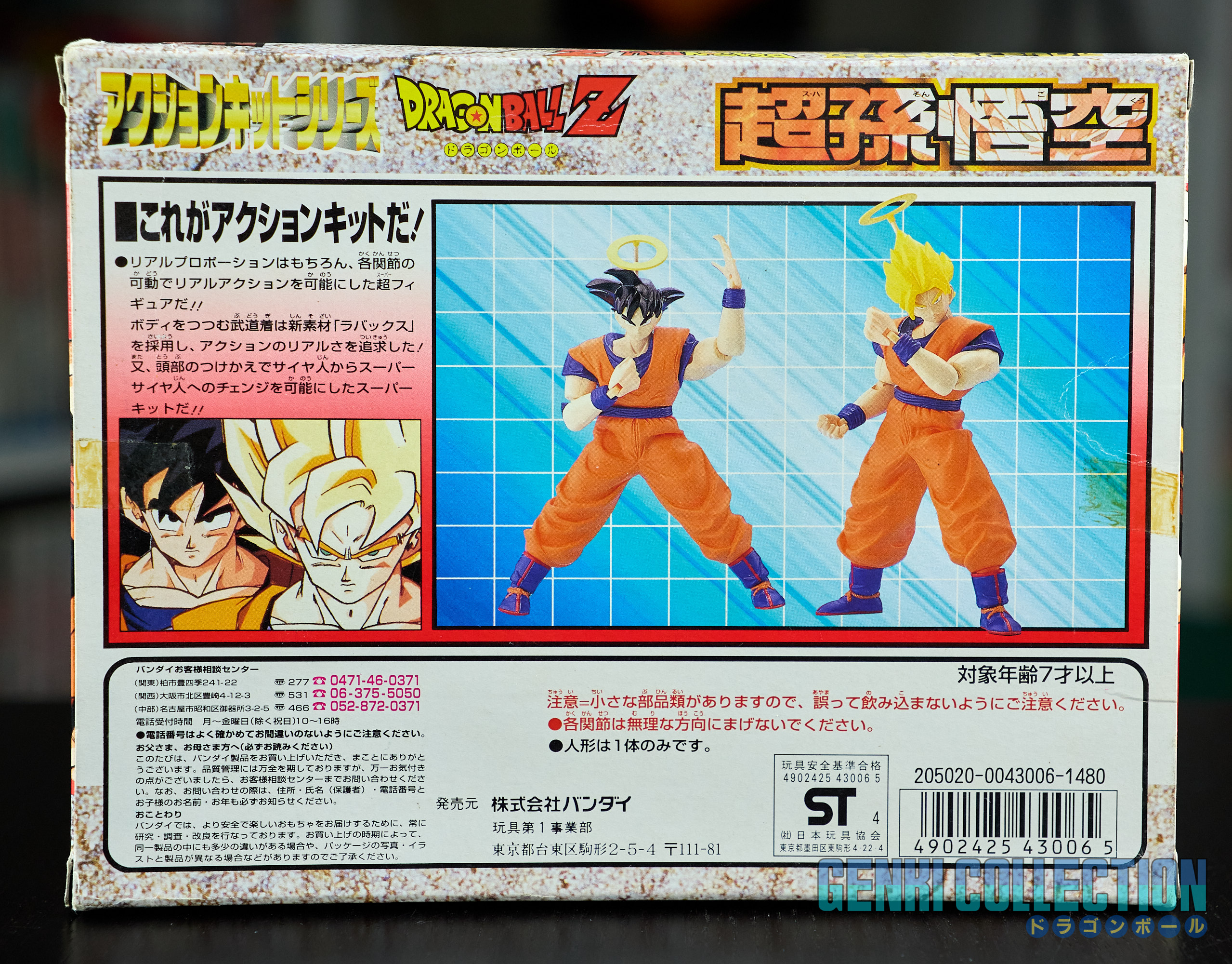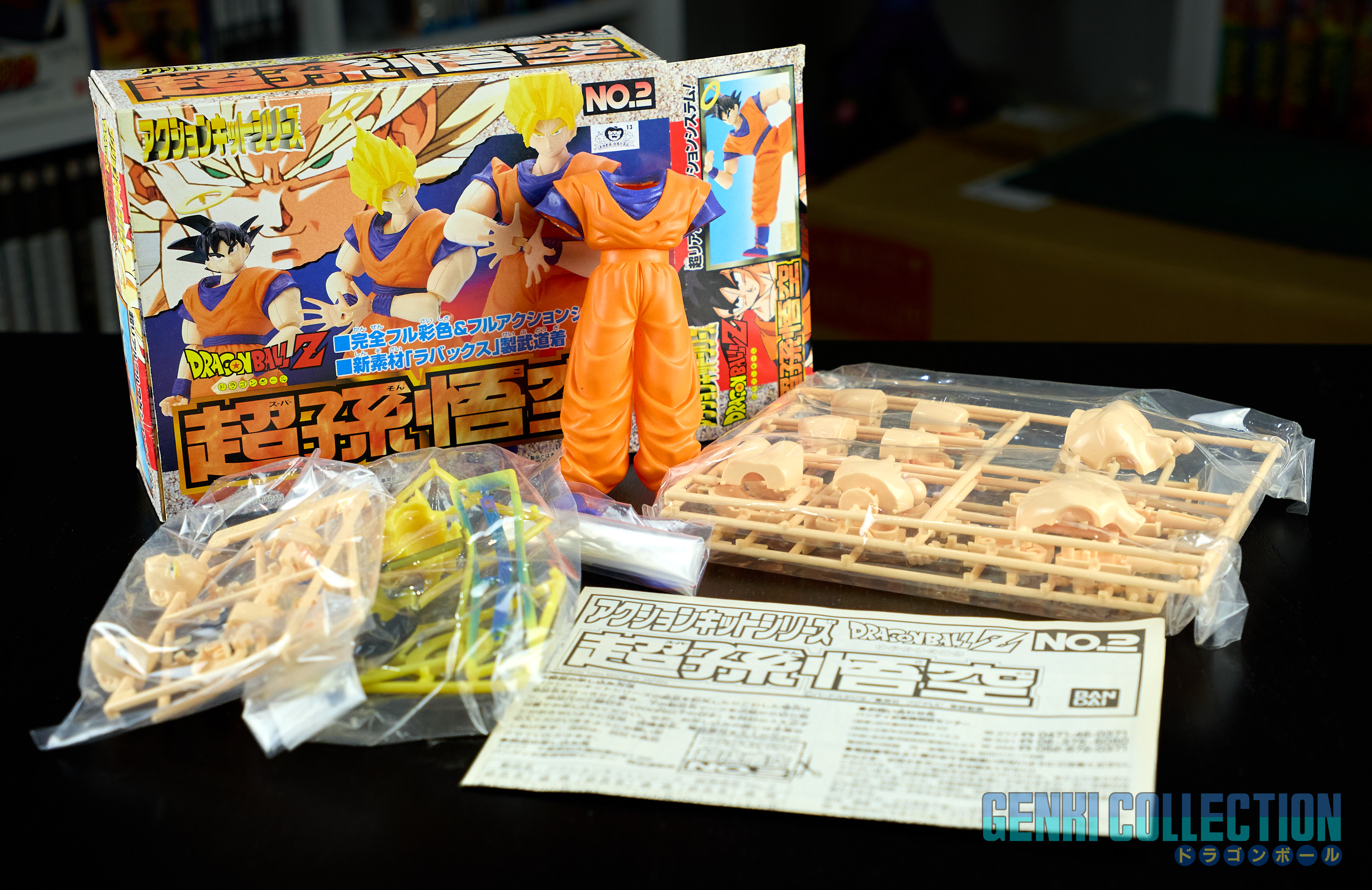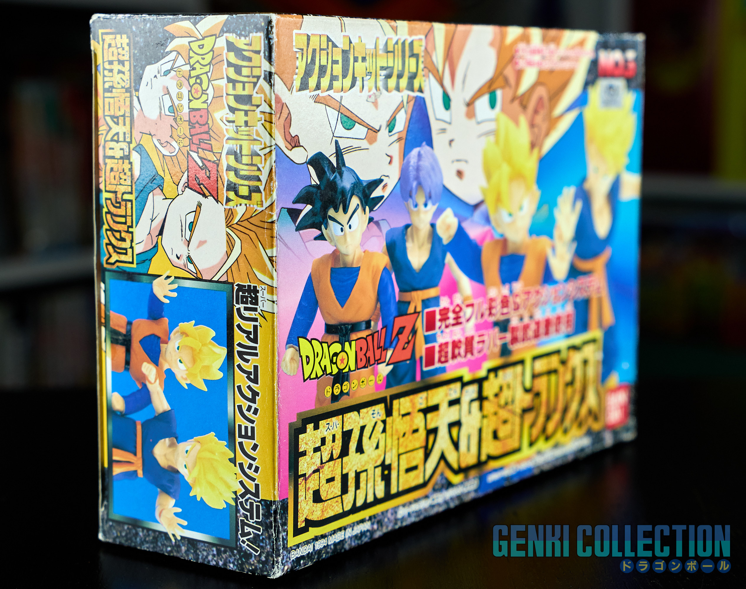 Set complet de 6 figurines Dragon Ball Z Action Kits de 1994 à 1995. 1ère édition Made in Japan, de meilleure facture que les rééditions Made in China (facilement identifiables avec les noms en anglais sur la face des boîtes, contrairement aux version japonaises uniquement en japonais). Ce sont de très belles figurines en maquettes à assembler facilement, sans doutes les plus fidèles de l'époque avec en plus des têtes interchangeables en forme normale et Super Saiyan. Les vêtements sont en caoutchouc de très bonne facture qui n'ont pas perdu de leur qualité avec le temps. Les kits numéros 1 et 2 ont l'avantage d'avoir un "volet" de présentation qui ne sera pas gardé pour les volumes suivants. Tous les kits sont en très bon état, les grappes non assemblées sons sous blisters toujours scellés et toutes les notices sont présentes. Des conditions rares pour ces kits généralement déjà assemblés !