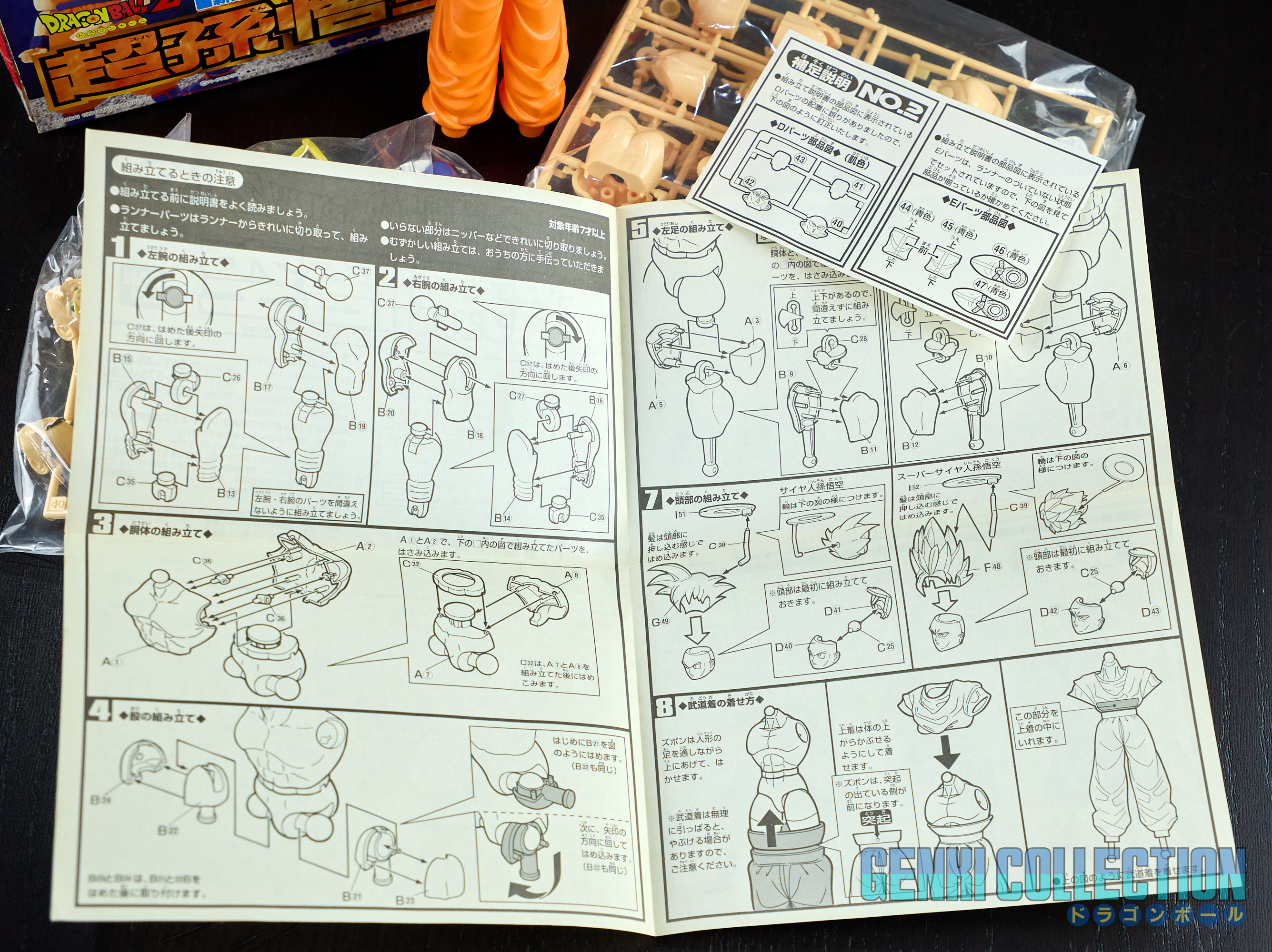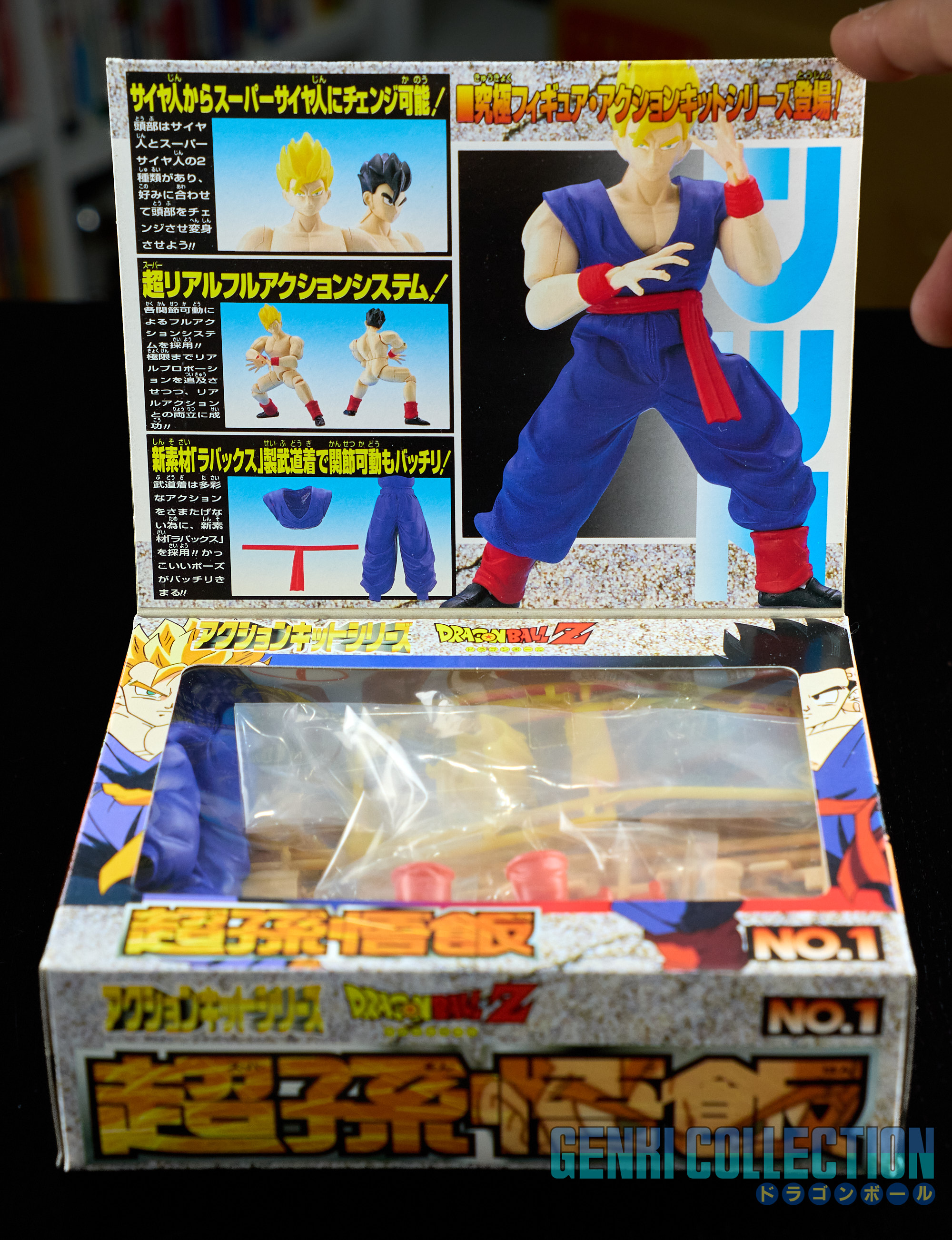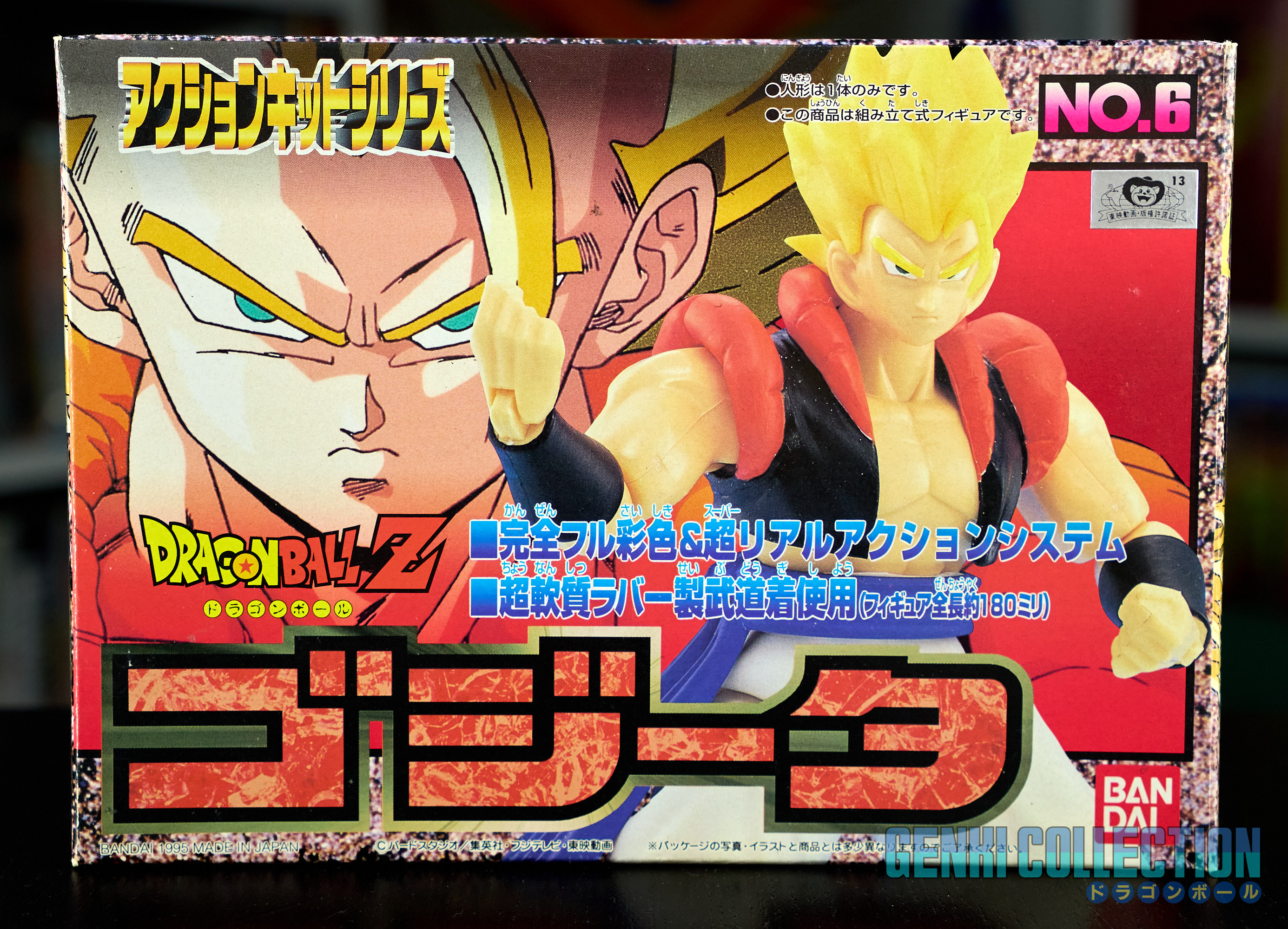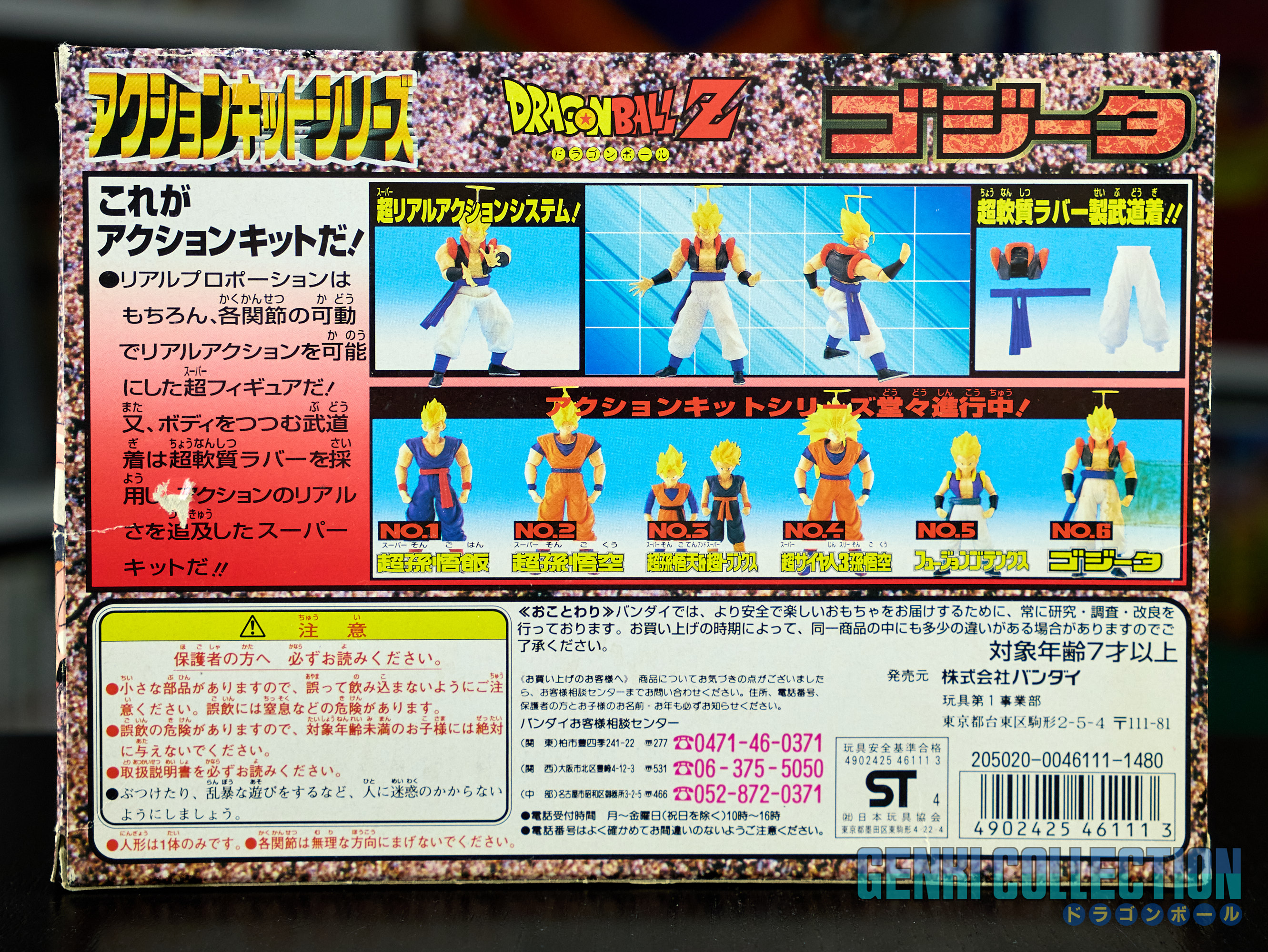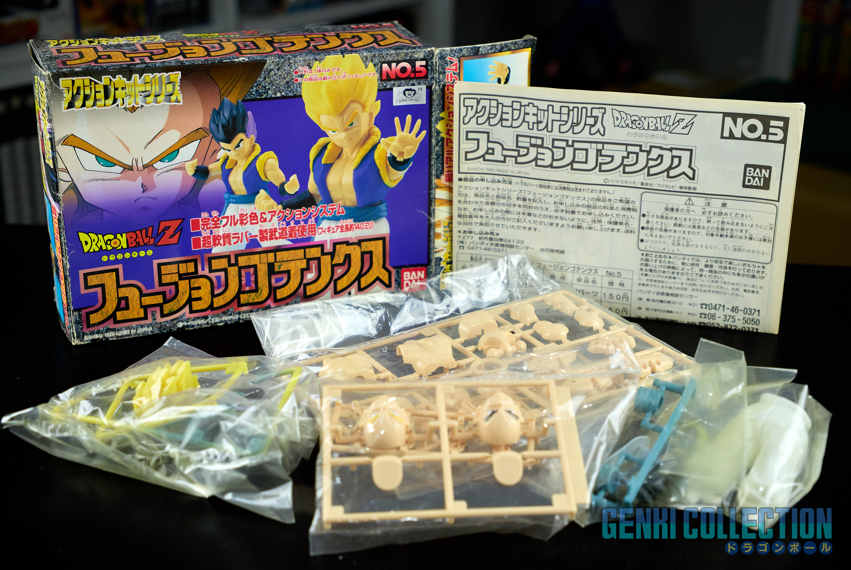 Set complet de 6 figurines Dragon Ball Z Action Kits de 1994 à 1995. 1ère édition Made in Japan, de meilleure facture que les rééditions Made in China (facilement identifiables avec les noms en anglais sur la face des boîtes, contrairement aux version japonaises uniquement en japonais). Ce sont de très belles figurines en maquettes à assembler facilement, sans doutes les plus fidèles de l'époque avec en plus des têtes interchangeables en forme normale et Super Saiyan. Les vêtements sont en caoutchouc de très bonne facture qui n'ont pas perdu de leur qualité avec le temps. Les kits numéros 1 et 2 ont l'avantage d'avoir un "volet" de présentation qui ne sera pas gardé pour les volumes suivants. Tous les kits sont en très bon état, les grappes non assemblées sons sous blisters toujours scellés et toutes les notices sont présentes. Des conditions rares pour ces kits généralement déjà assemblés !