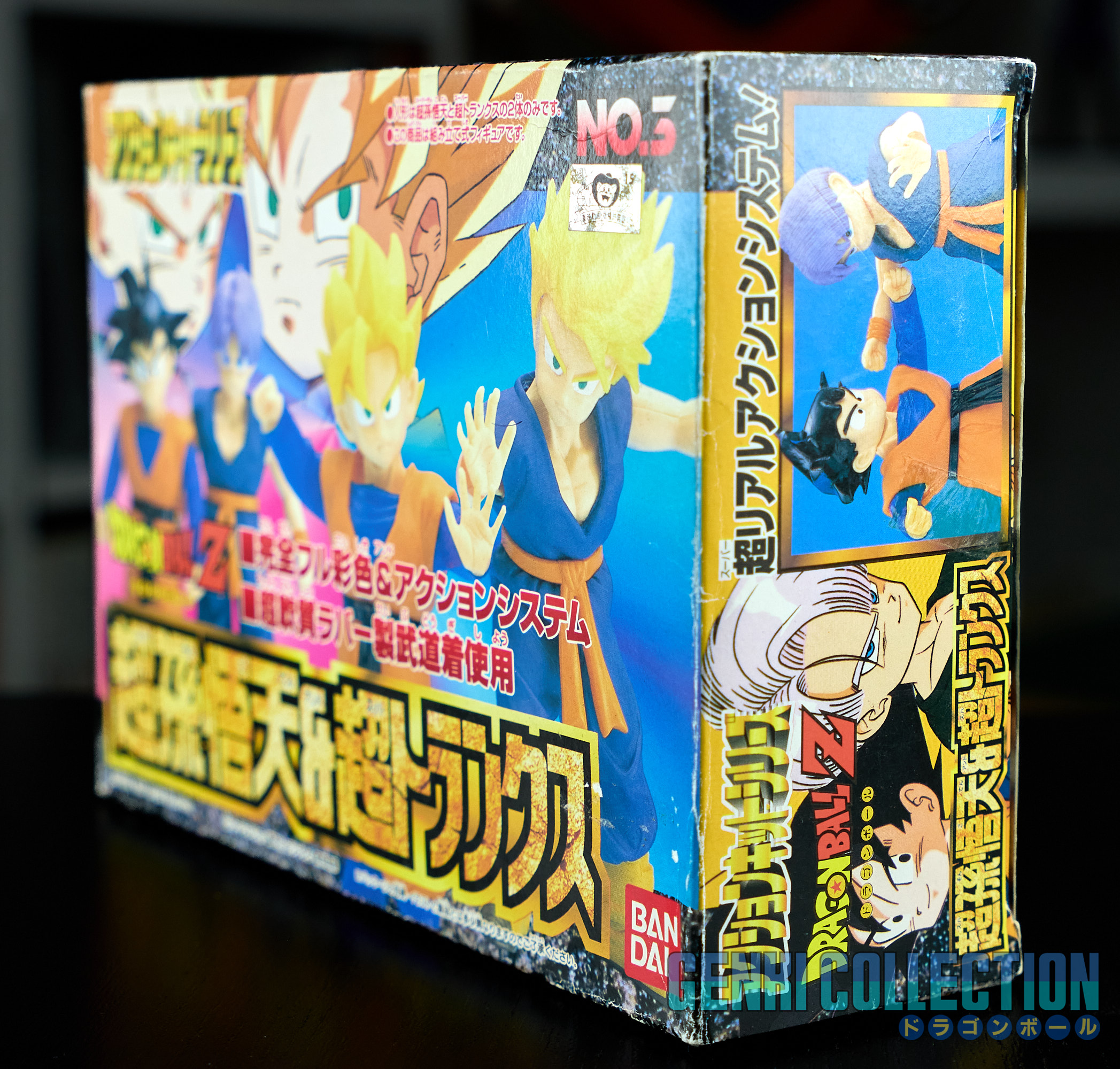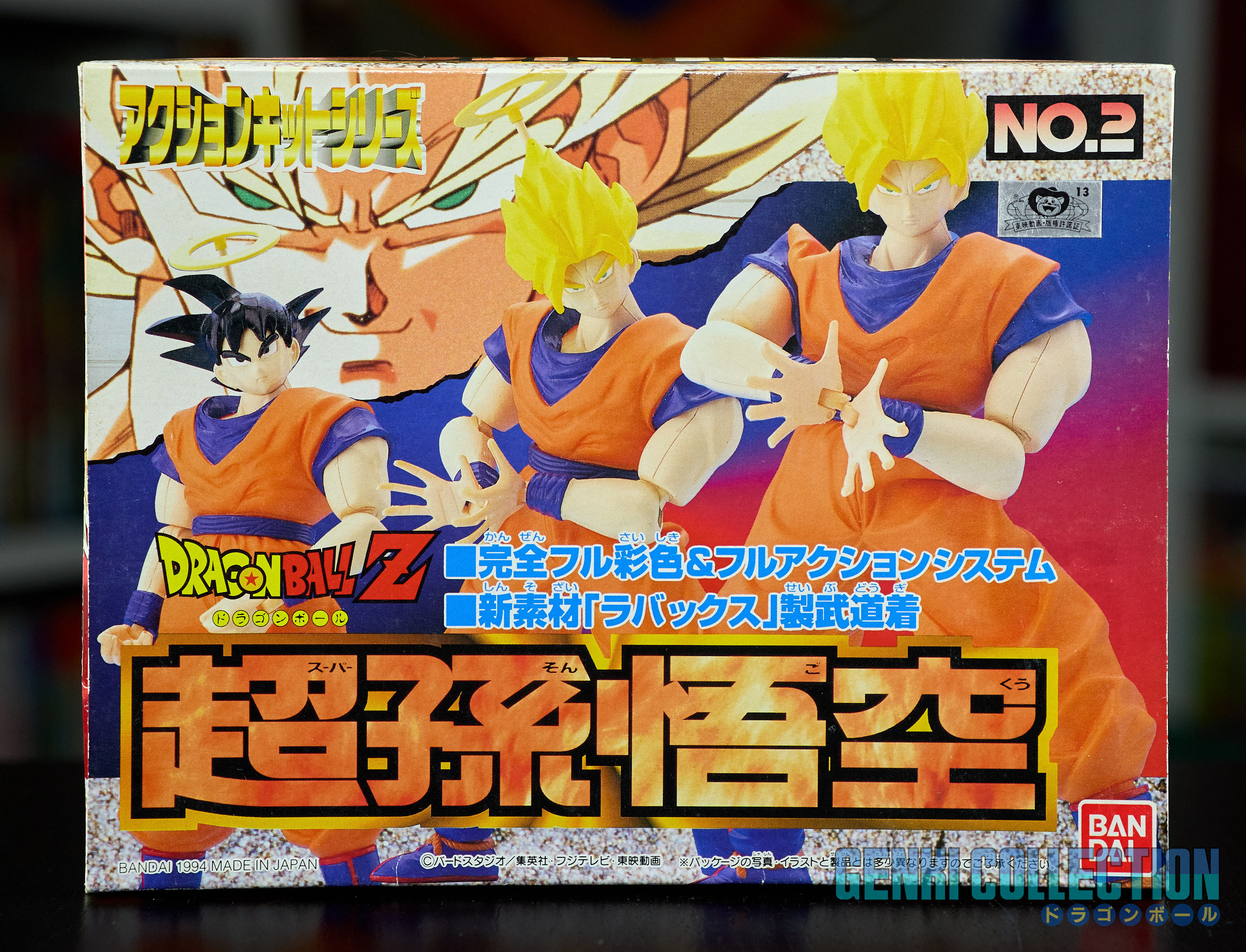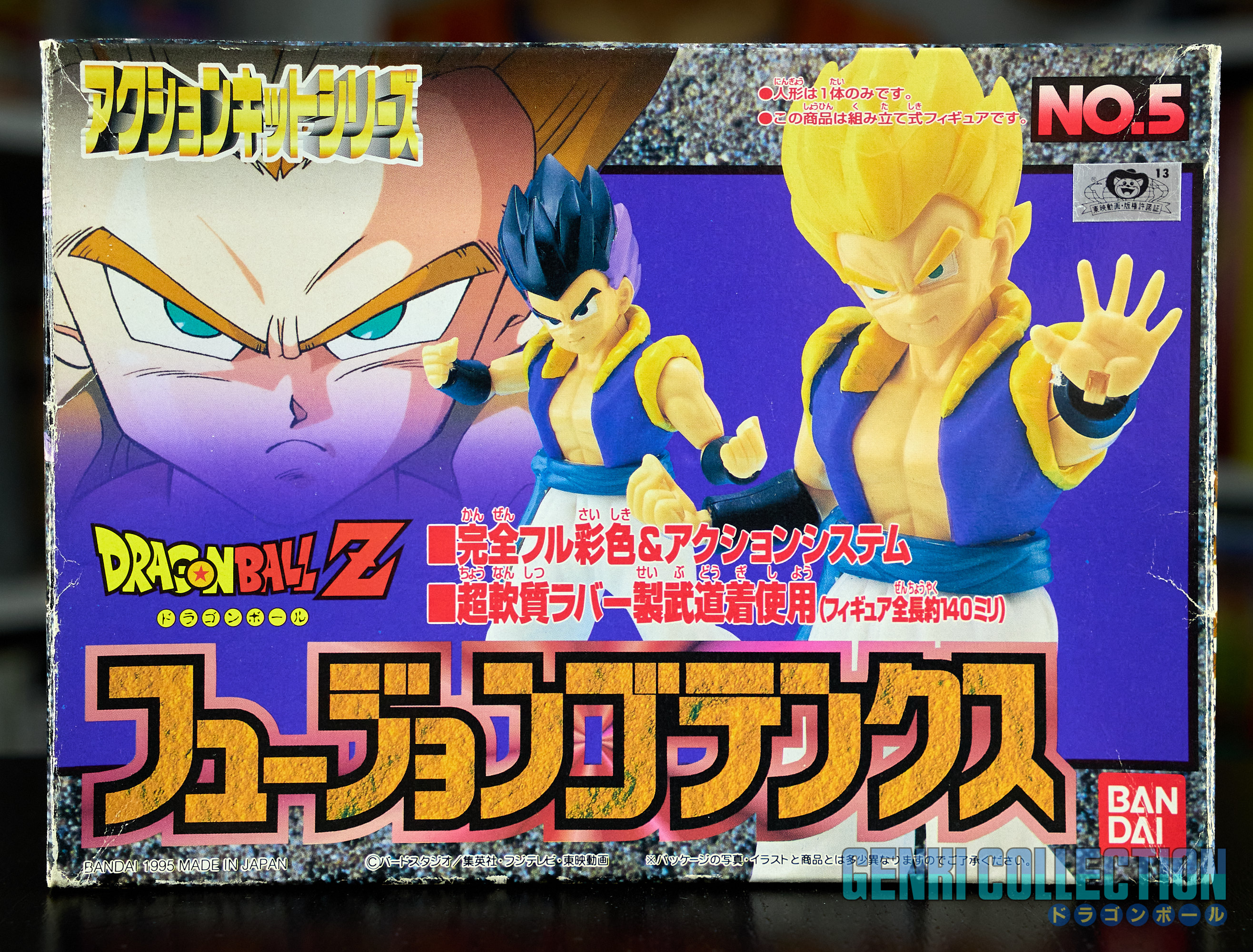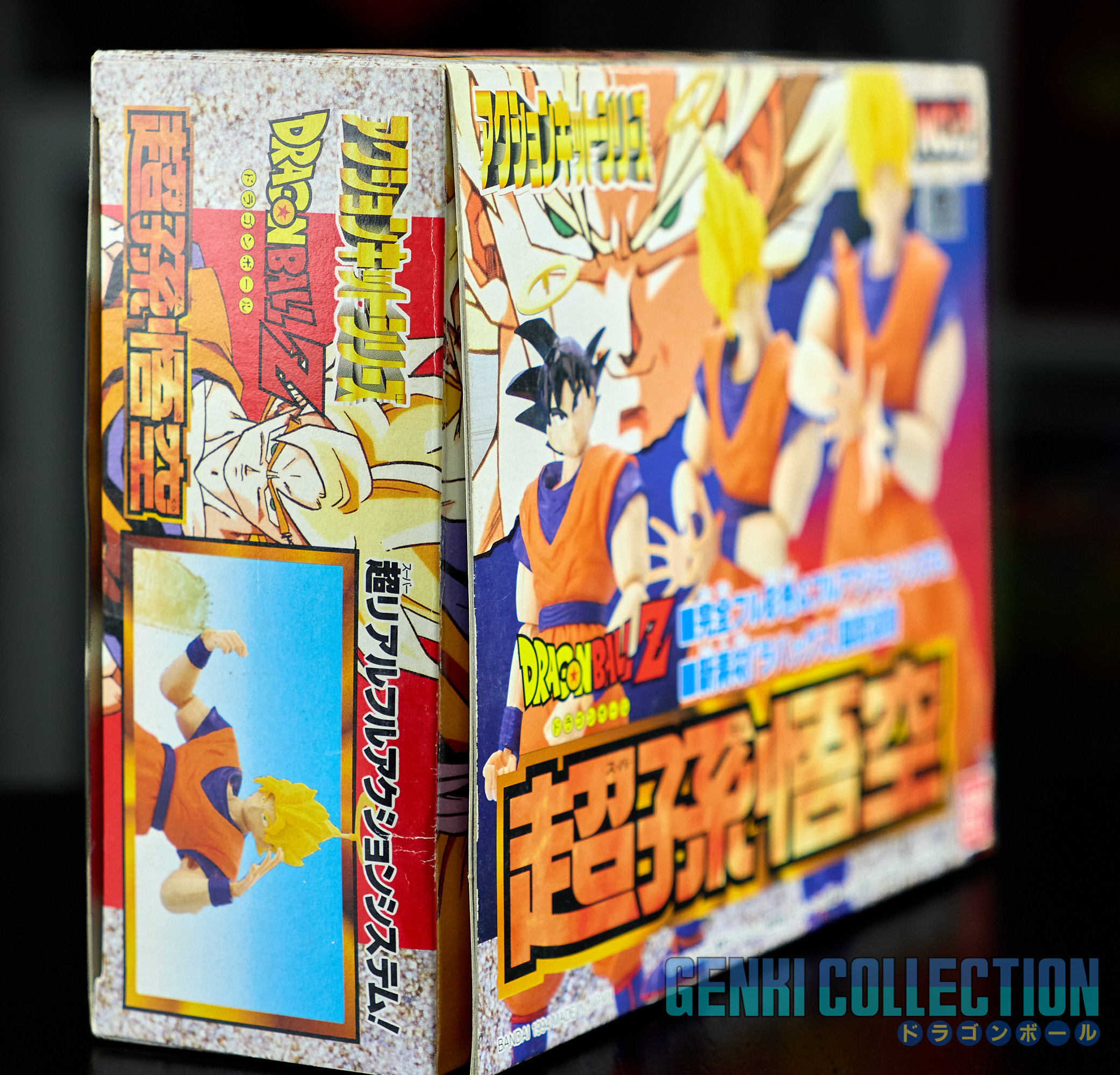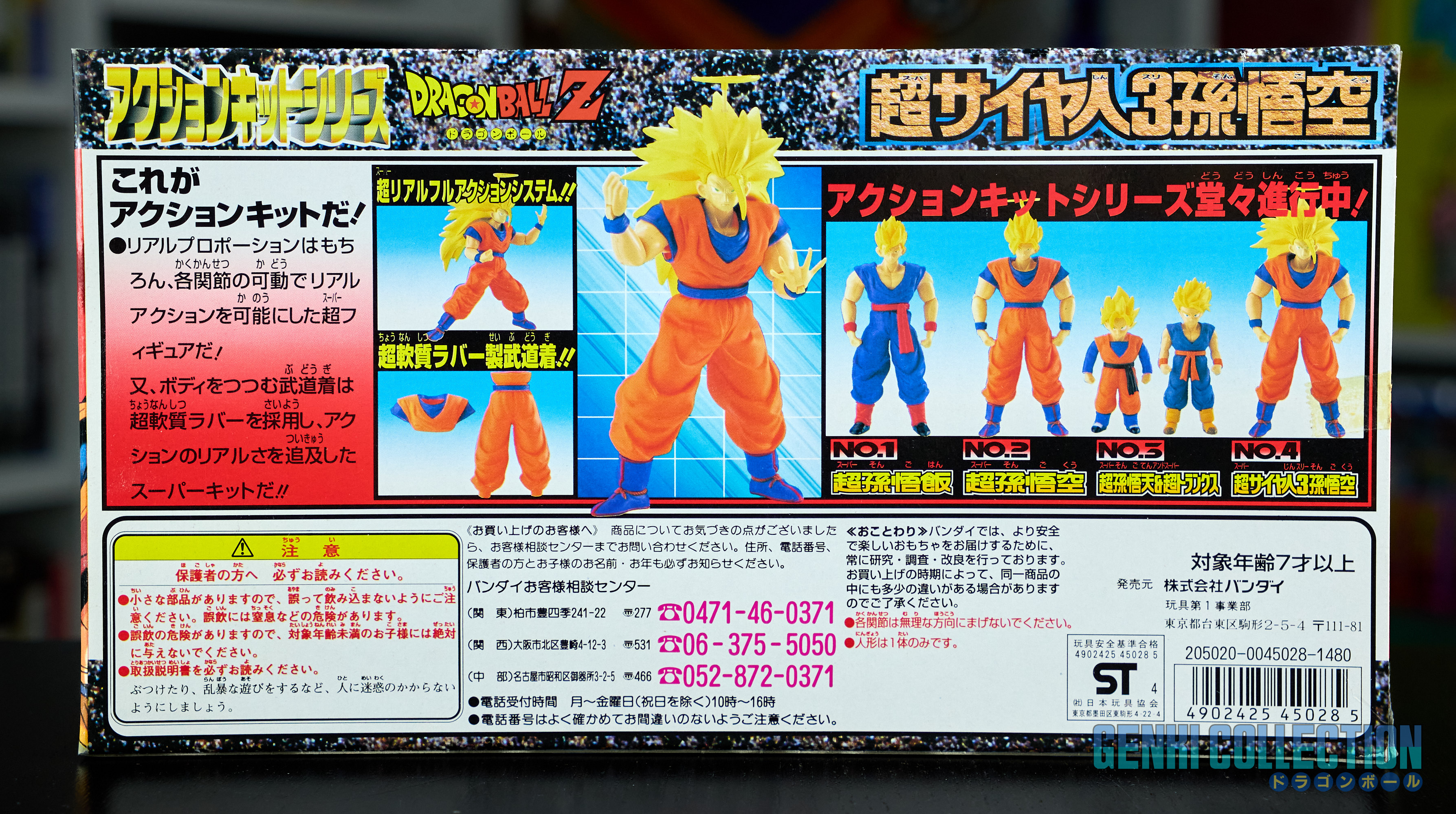 Set complet de 6 figurines Dragon Ball Z Action Kits de 1994 à 1995. 1ère édition Made in Japan, de meilleure facture que les rééditions Made in China (facilement identifiables avec les noms en anglais sur la face des boîtes, contrairement aux version japonaises uniquement en japonais). Ce sont de très belles figurines en maquettes à assembler facilement, sans doutes les plus fidèles de l'époque avec en plus des têtes interchangeables en forme normale et Super Saiyan. Les vêtements sont en caoutchouc de très bonne facture qui n'ont pas perdu de leur qualité avec le temps. Les kits numéros 1 et 2 ont l'avantage d'avoir un "volet" de présentation qui ne sera pas gardé pour les volumes suivants. Tous les kits sont en très bon état, les grappes non assemblées sons sous blisters toujours scellés et toutes les notices sont présentes. Des conditions rares pour ces kits généralement déjà assemblés !