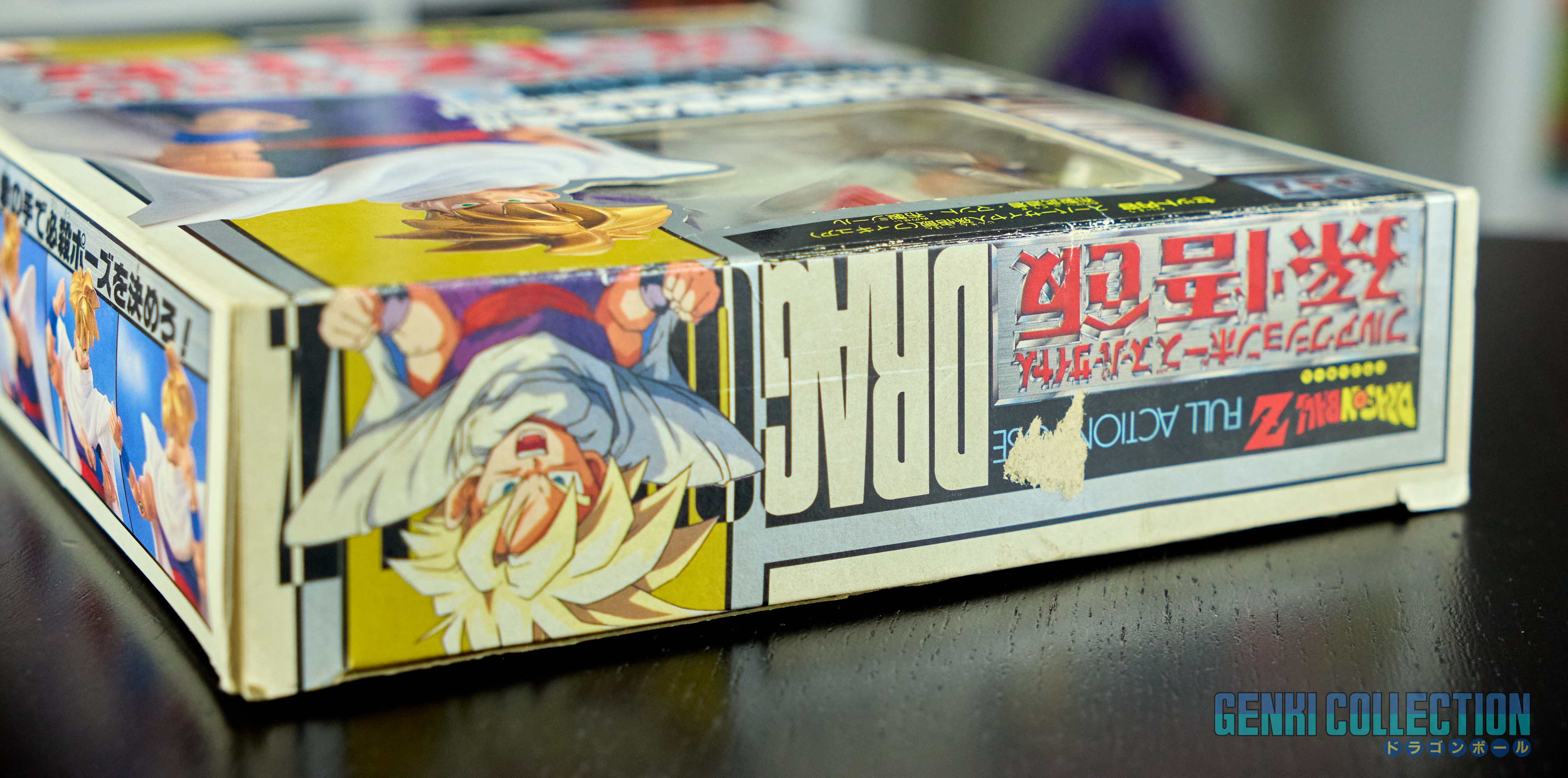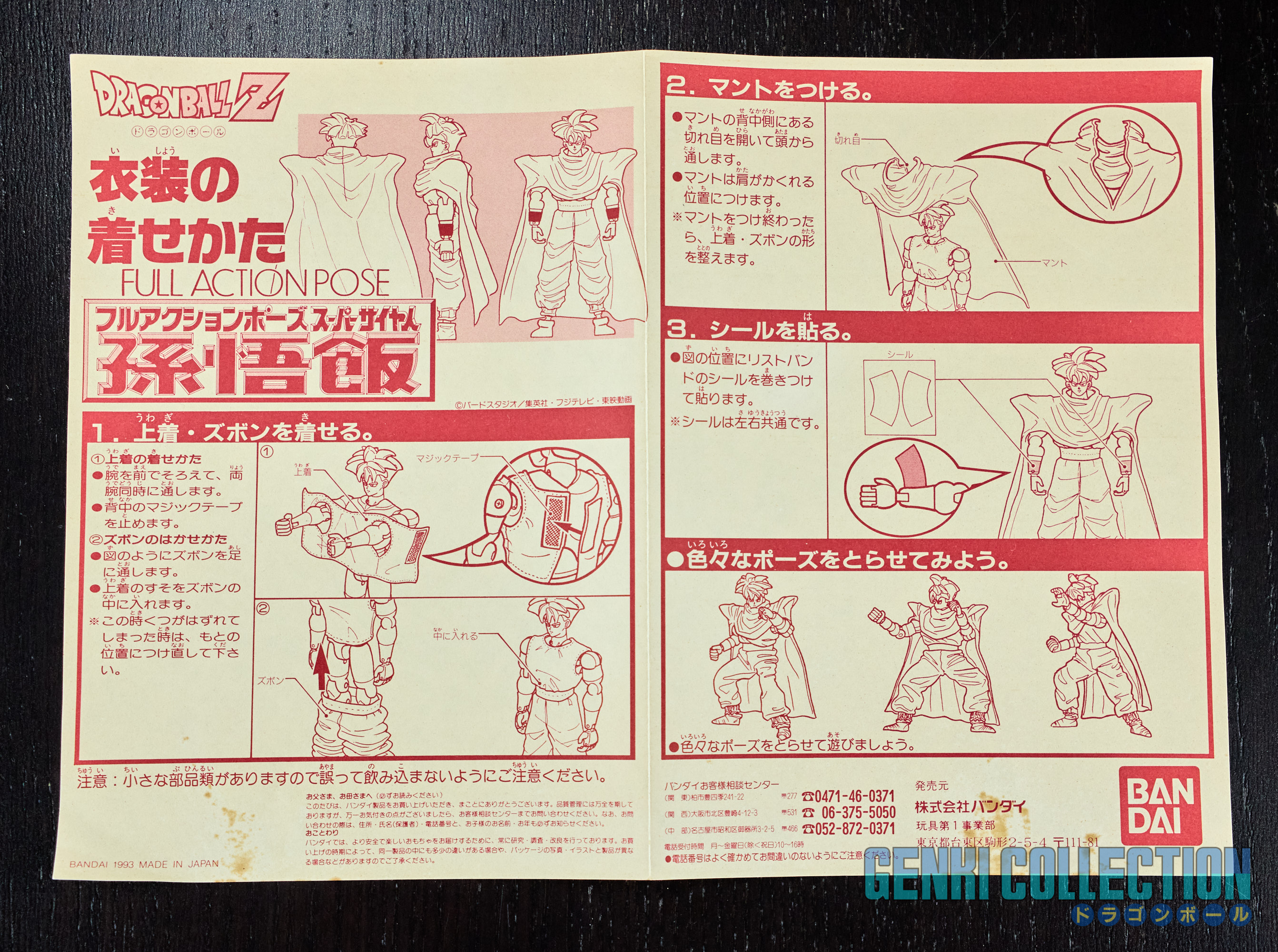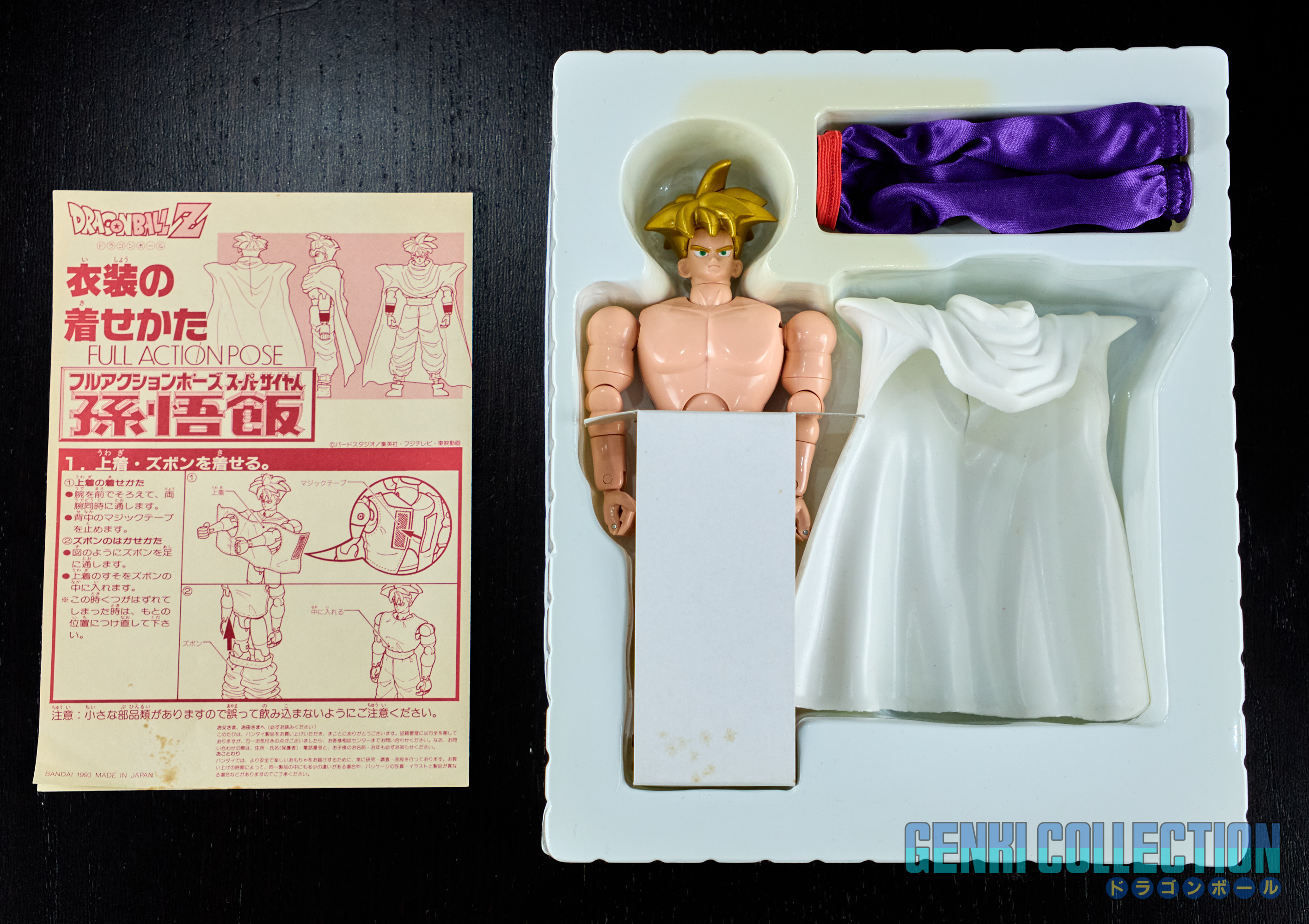 Figurine rare et d'époque de Son Gohan, série Full Action Pose éditée par Bandai en 1993. Boîte un peu abîmée, mais intérieur en excellent état. Les protèges poignets n'ont jamais été collés et les vêtements en tissus sont éclatants et ne présentent aucune usure (comme neufs).La figurine est parfaitement rigide, ce qui est rare, généralement ces modèles sont facilement "désarticulés". Elle n'a donc jamais été manipulée. La notice est également présente.