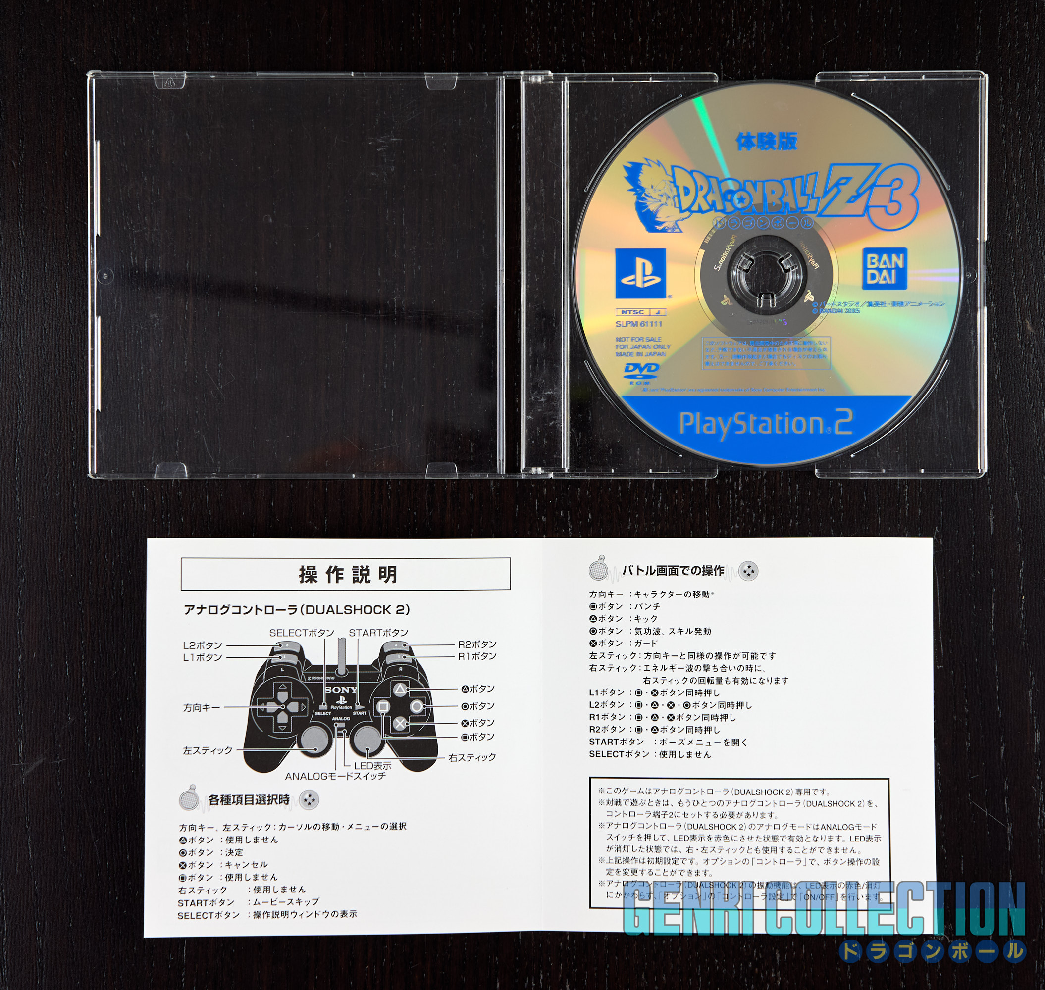 Lot de 2 disques de démos de jeux DRAGON BALL Z + 3 DVD promotionnelsLot comprenant 2 disques de démonstrations des jeux DRAGON BALL Z 3 sur PLAYSTATION 2 (version japonaise) et DRAGON BALL Z BUDOKAI TENKAICHI (version européenne) ainsi que 3 DVD japonais promotionnels des jeux DRAGON BALL Z 3, DRAGON BALL Z SPARKING NEO et SUPER DRAGON BALL Z. Ces produits sont rares car jamais distribués dans le commerce. Ils étaient dédiés aux journalistes pour la promotion des jeux, d'où les mentions "NOT FOR SALE".
